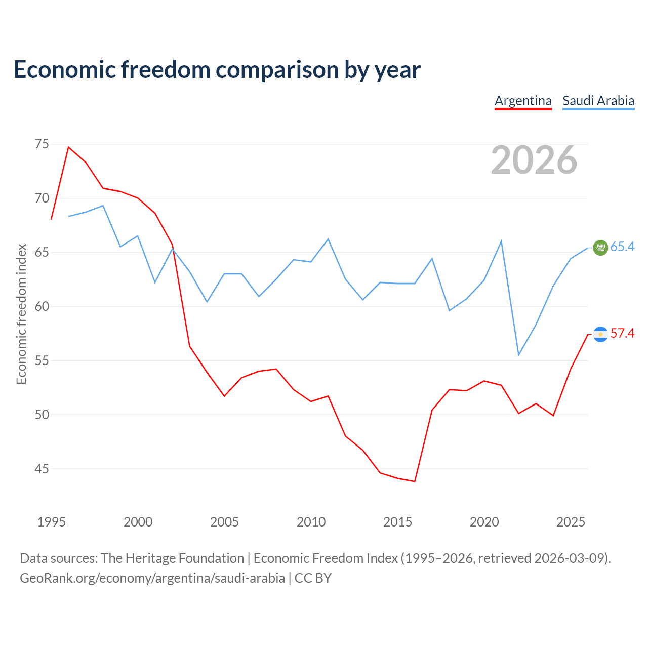 The Economic Freedom Index for Argentina is 57.4, ranking 117/197, compared to 65.4 for Saudi Arabia, ranking 65/197. The chart above displays a comparison of annual changes in economic freedom indexes.