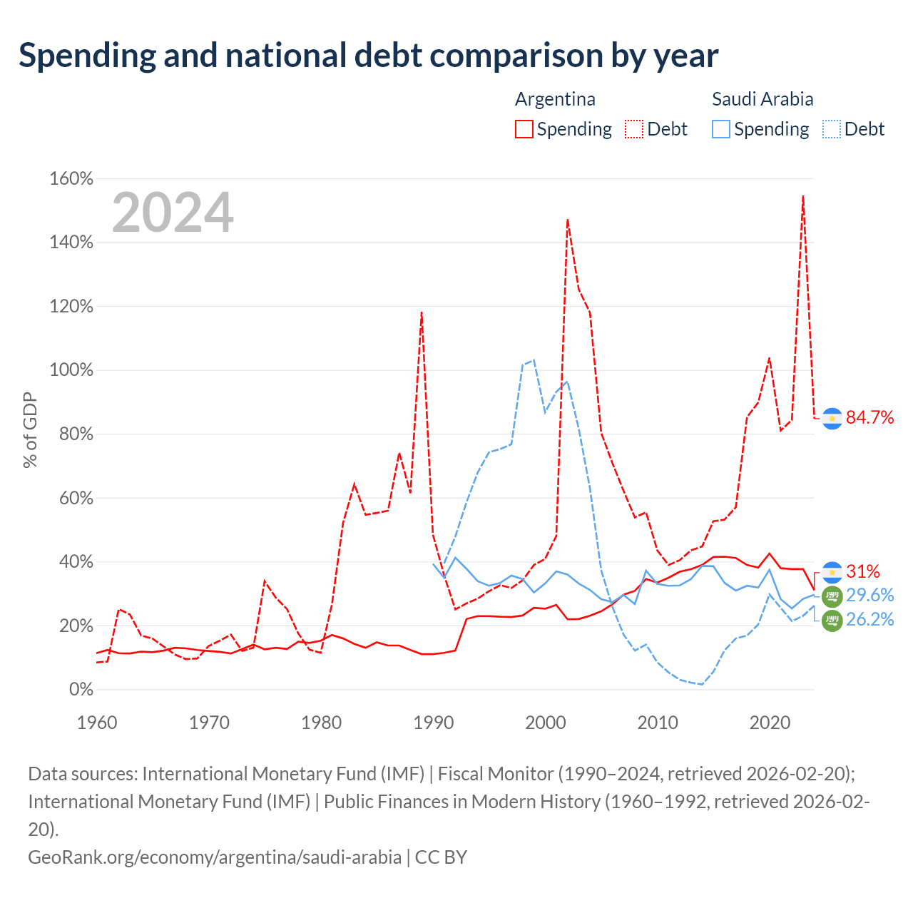 Argentina has $540B in government debt (84.7% of GDP), compared to $324B (26.2% of GDP) in Saudi Arabia.
