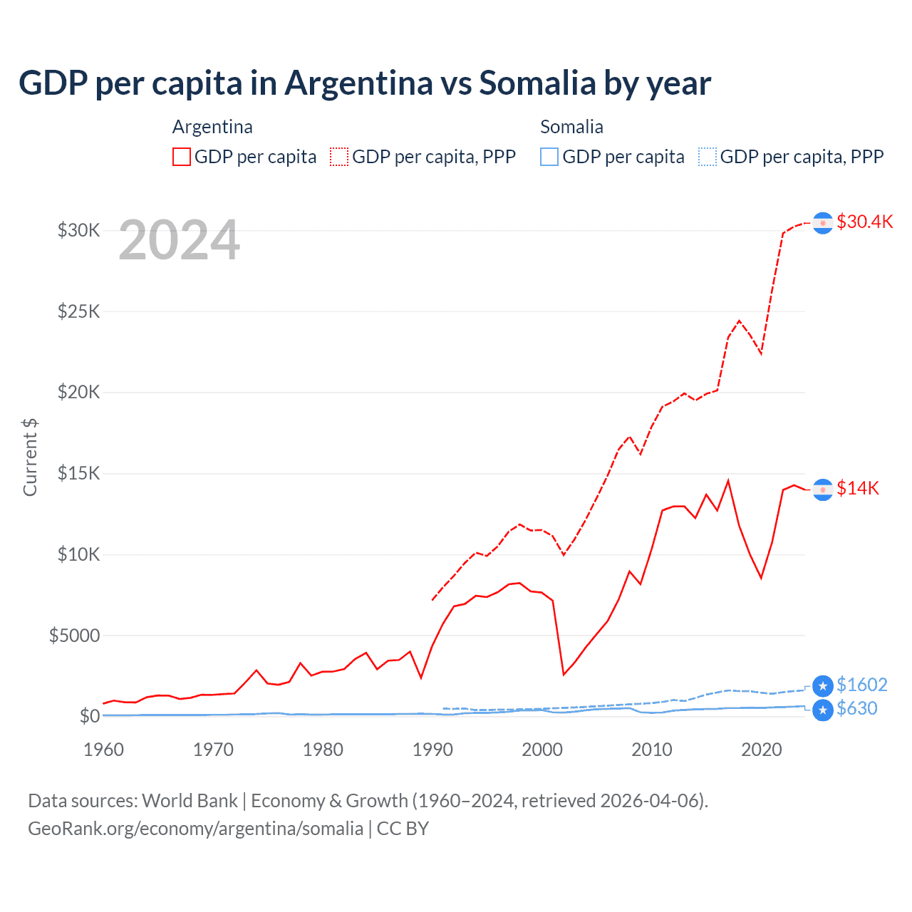 GDP per capita in Argentina vs Somalia by year