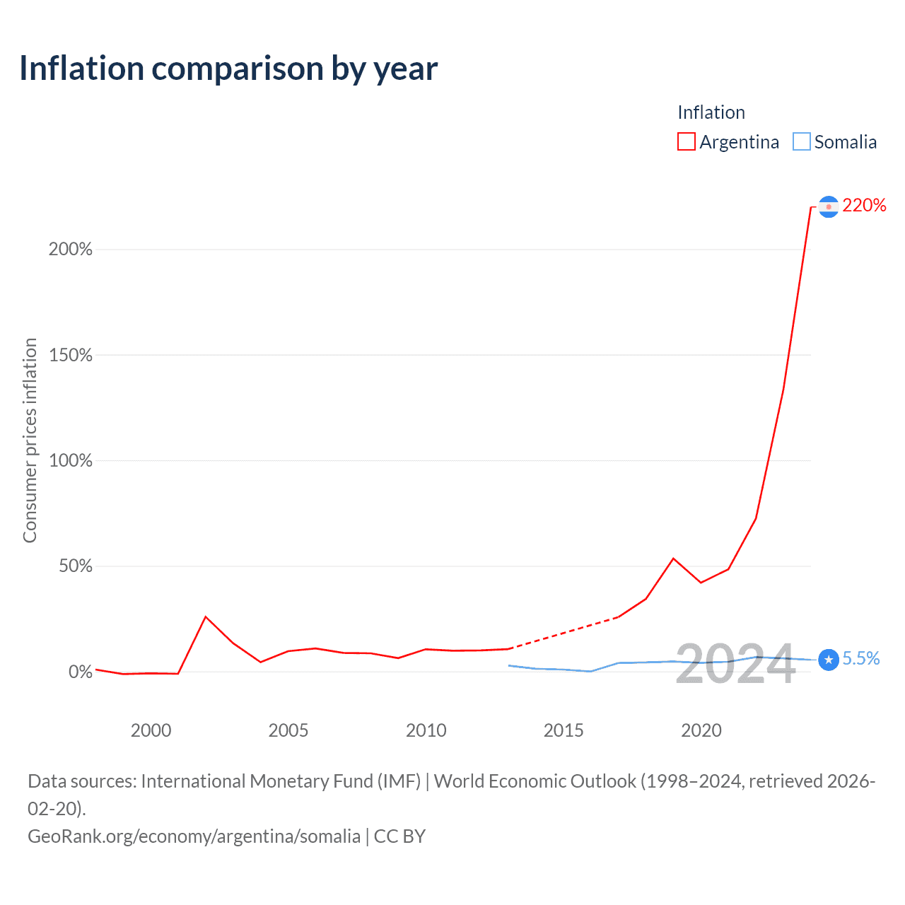 Over the past 12 years, Argentina has recorded an average annual inflation rate of 71.1%, compared with 3.77% in Somalia. In 2024, inflation was 219.9% in Argentina and 5.5% in Somalia.