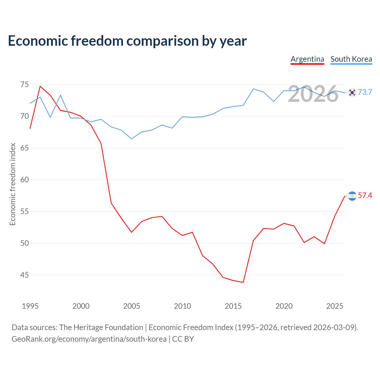 The Economic Freedom Index for Argentina is 57.4, ranking 117/197, compared to 73.7 for South Korea, ranking 24/197. The chart above displays a comparison of annual changes in economic freedom indexes.