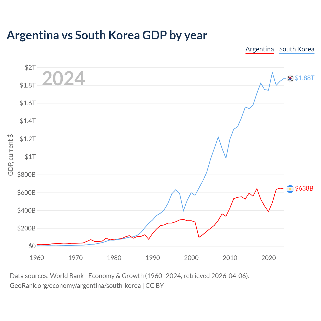 Argentina has a GDP of $638B compared to $1.88T for South Korea, ranking 24/197 and 12/197 by economy size, respectively.