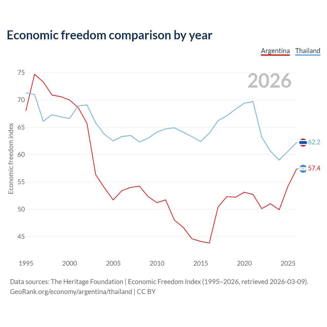 The Economic Freedom Index for Argentina is 57.4, ranking 117/197, compared to 62.2 for Thailand, ranking 88/197. The chart above displays a comparison of annual changes in economic freedom indexes.