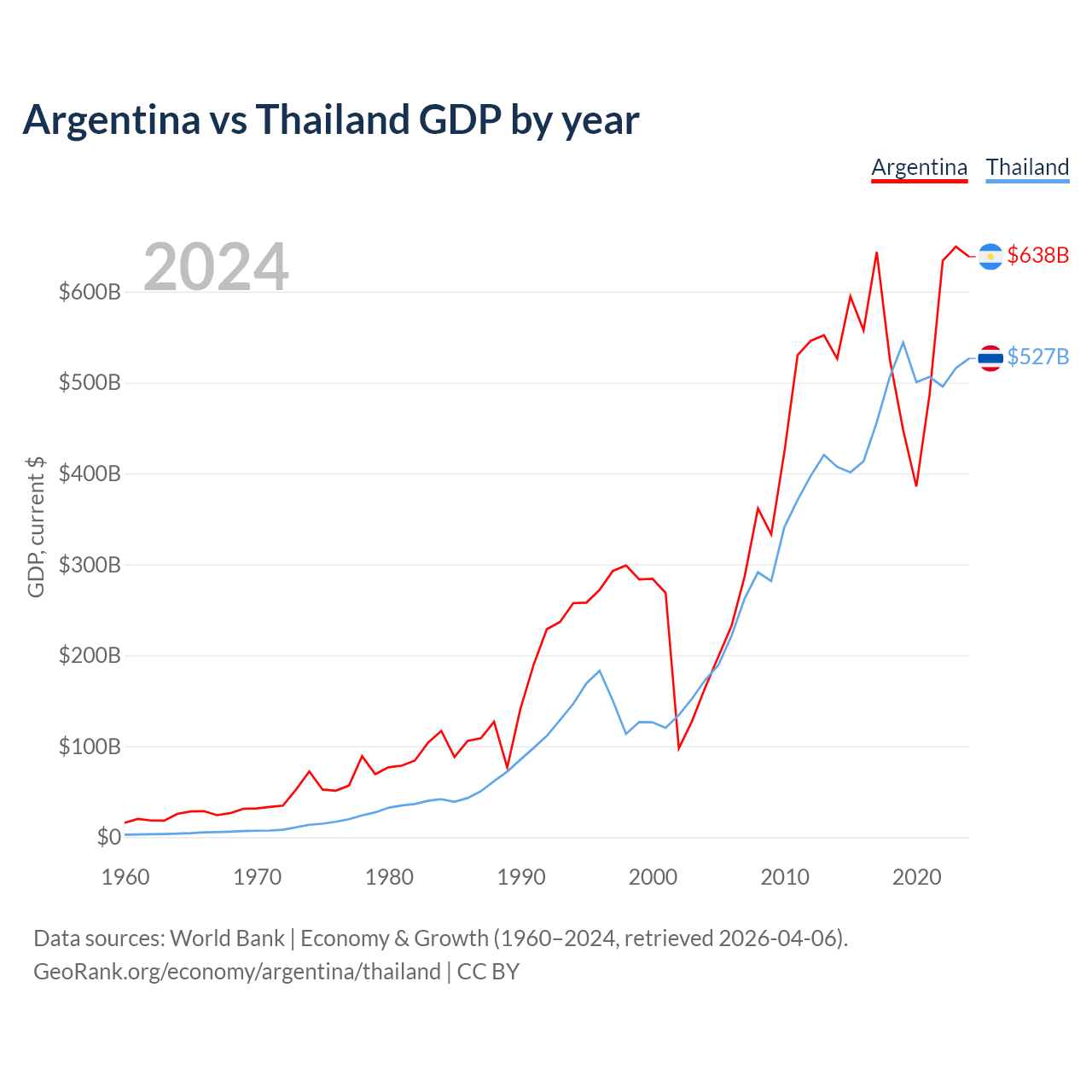 Argentina has a GDP of $638B compared to $527B for Thailand, ranking 24/197 and 31/197 by economy size, respectively.
