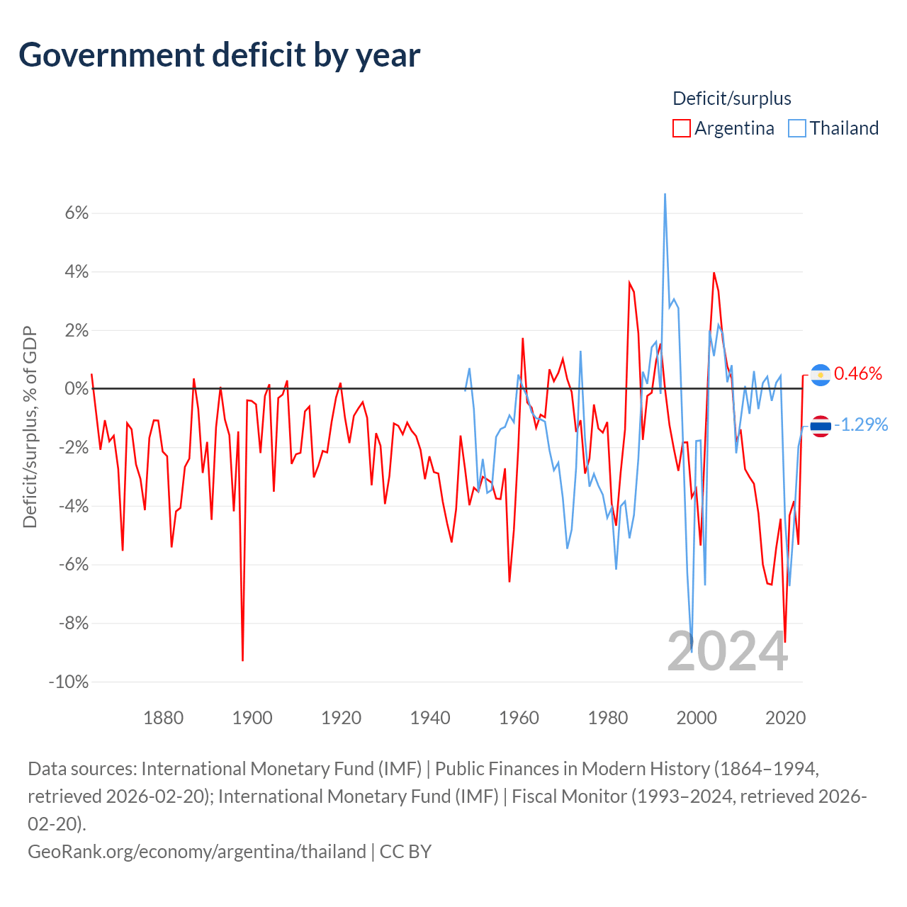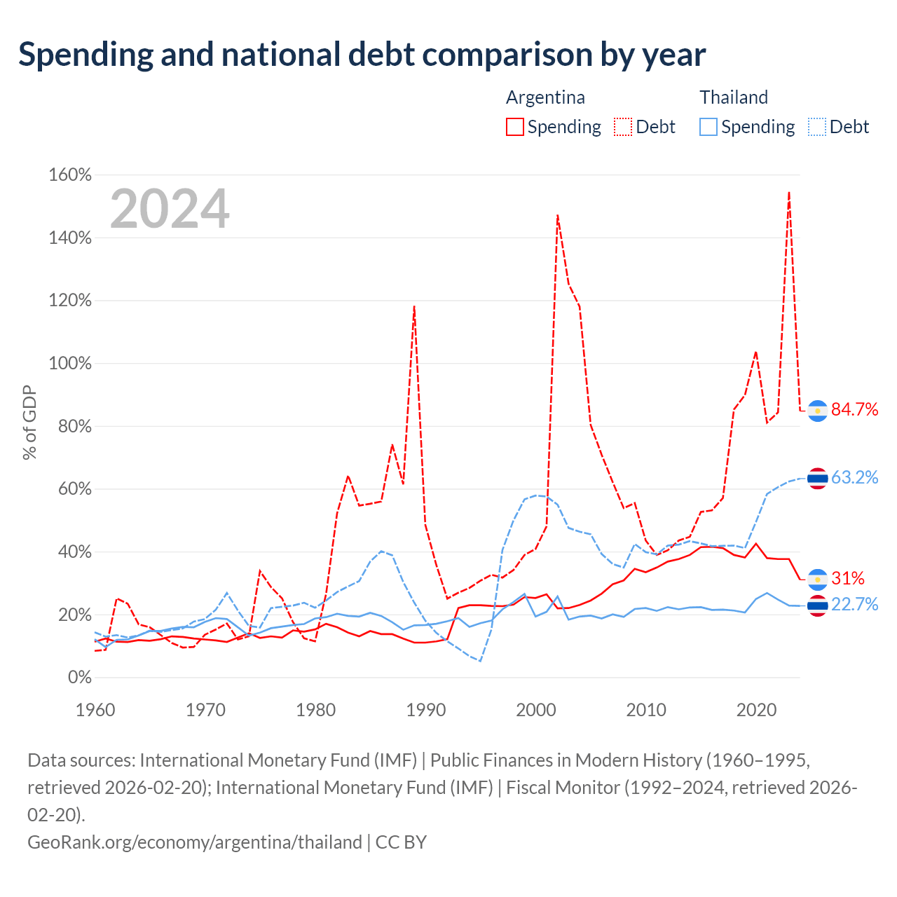 Argentina has $540B in government debt (84.7% of GDP), compared to $333B (63.2% of GDP) in Thailand.