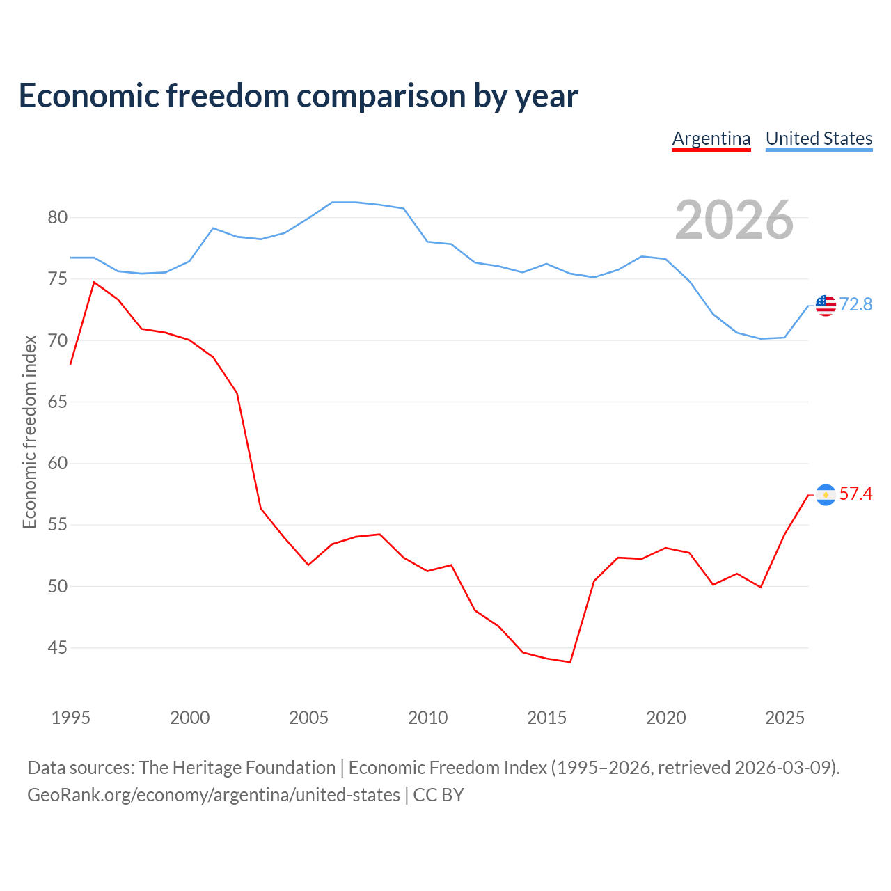The Economic Freedom Index for Argentina is 57.4, ranking 117/197, compared to 72.8 for the United States, ranking 27/197. The chart above displays a comparison of annual changes in economic freedom indexes.