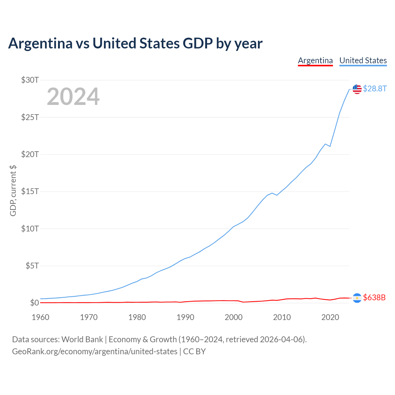 Argentina has a GDP of $638B compared to $28.8T for the United States, ranking 24/197 and 1/197 by economy size, respectively.