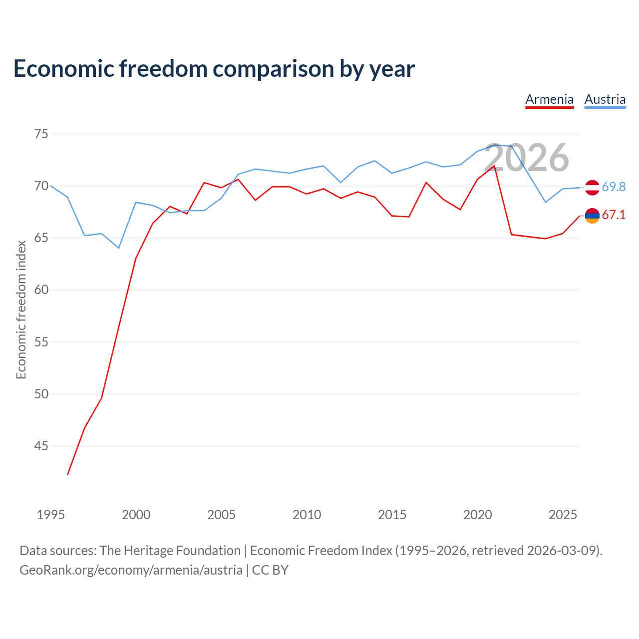 The Economic Freedom Index for Armenia is 67.1, ranking 58/197, compared to 69.8 for Austria, ranking 38/197. The chart above displays a comparison of annual changes in economic freedom indexes.