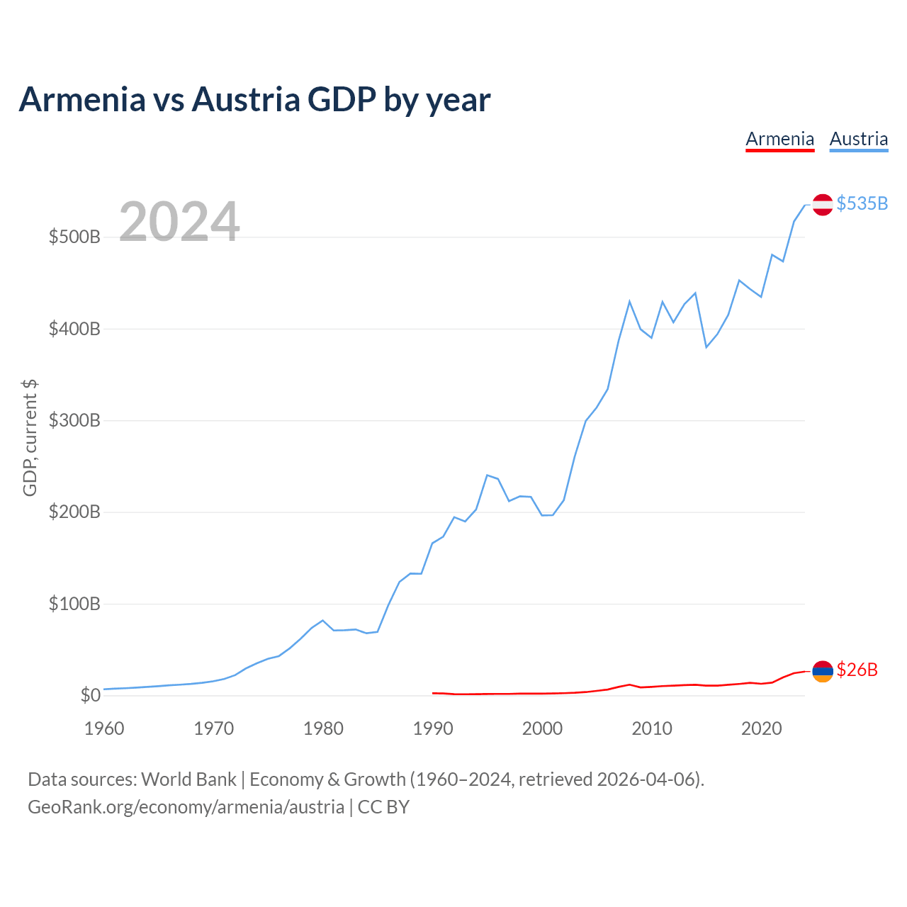 Armenia has a GDP of $26B compared to $535B for Austria, ranking 114/197 and 30/197 by economy size, respectively.