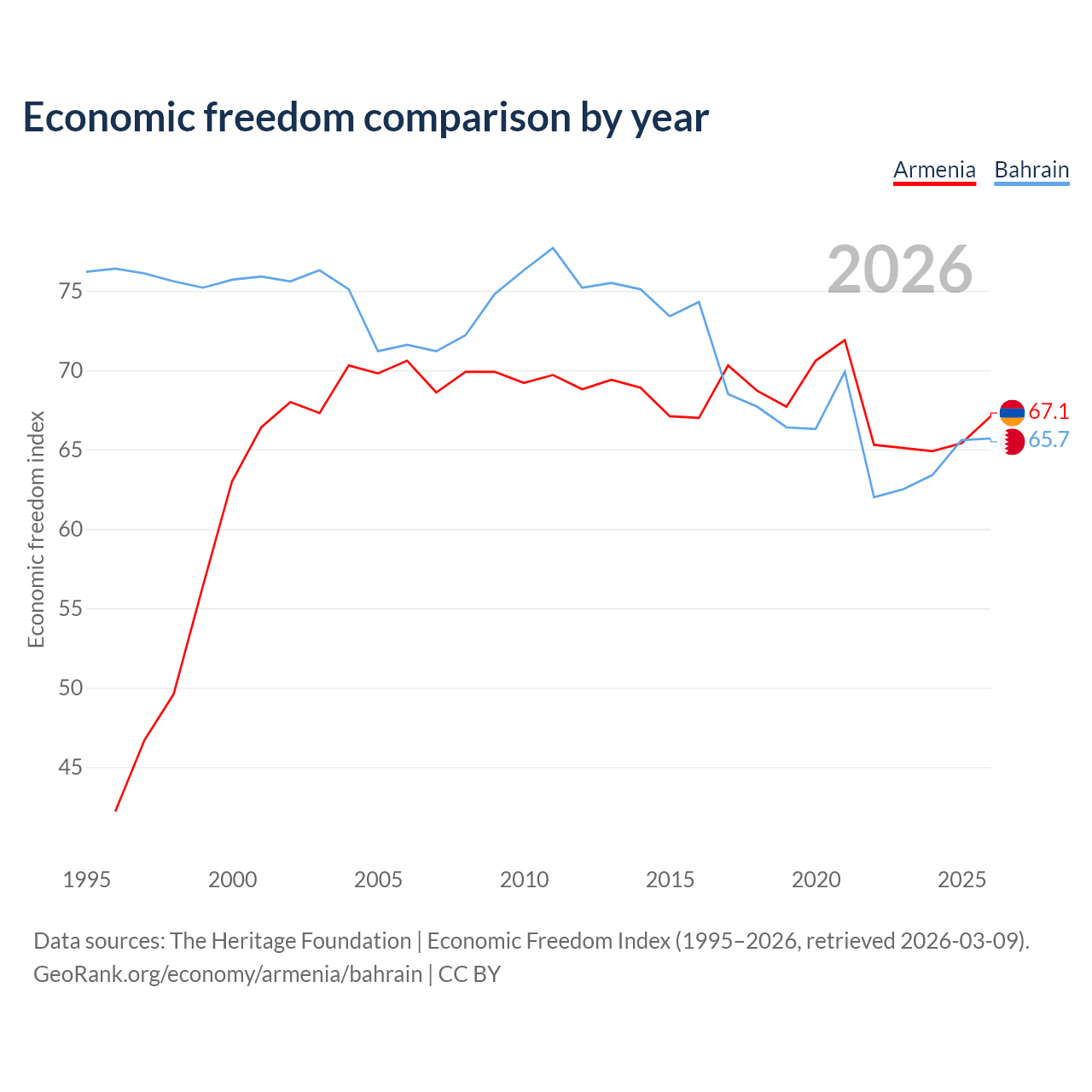 The Economic Freedom Index for Armenia is 67.1, ranking 58/197, compared to 65.7 for Bahrain, ranking 63/197. The chart above displays a comparison of annual changes in economic freedom indexes.