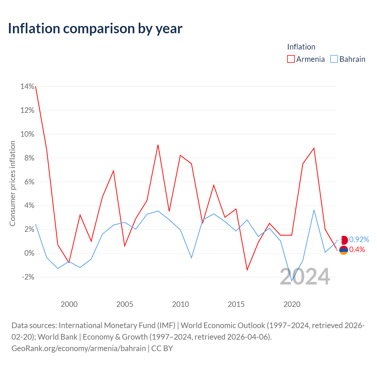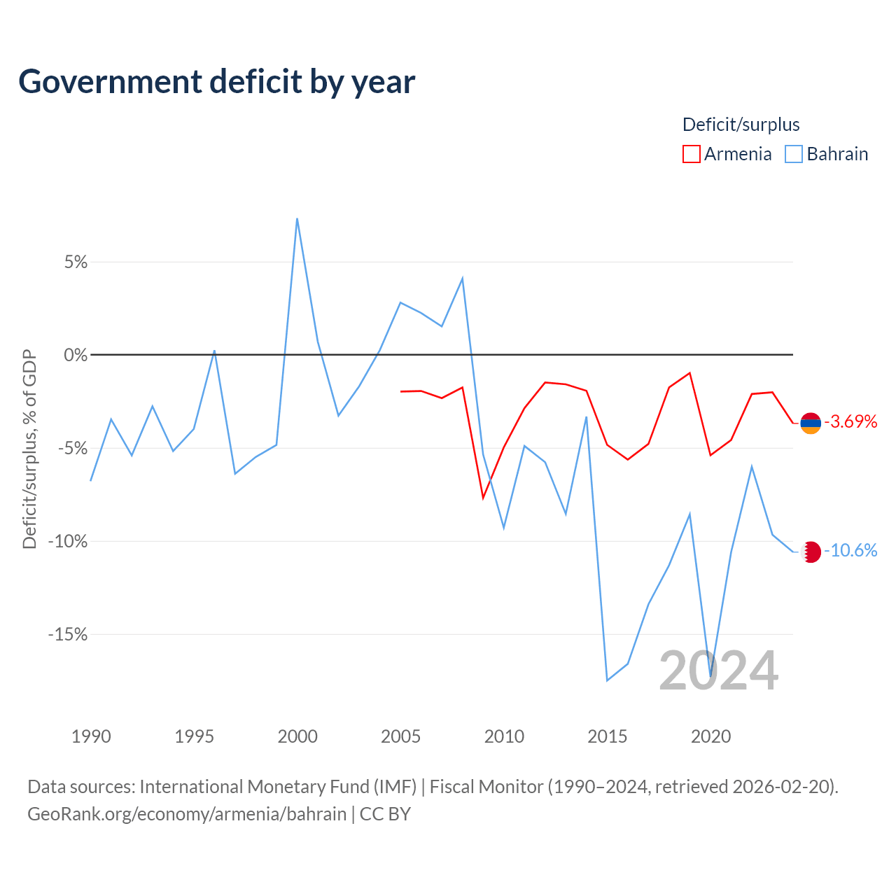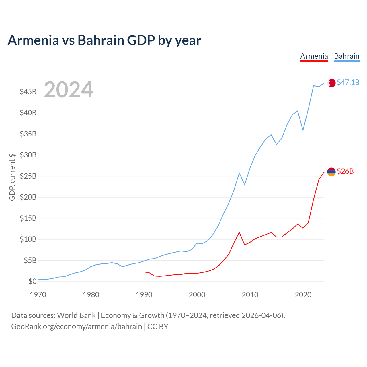 Armenia has a GDP of $26B compared to $47.1B for Bahrain, ranking 114/197 and 96/197 by economy size, respectively.