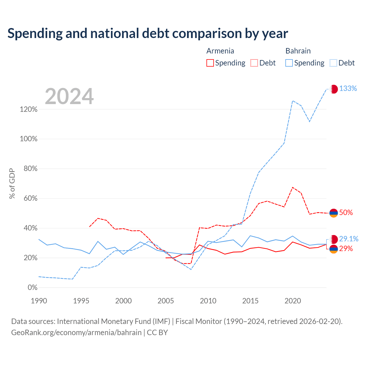 Armenia has $13B in government debt (50% of GDP), compared to $62.8B (133.4% of GDP) in Bahrain.