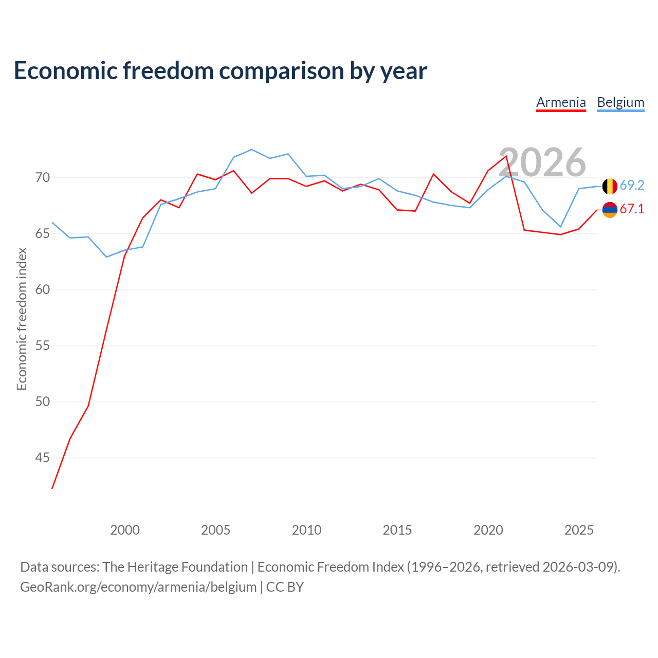 The Economic Freedom Index for Armenia is 67.1, ranking 58/197, compared to 69.2 for Belgium, ranking 42/197. The chart above displays a comparison of annual changes in economic freedom indexes.
