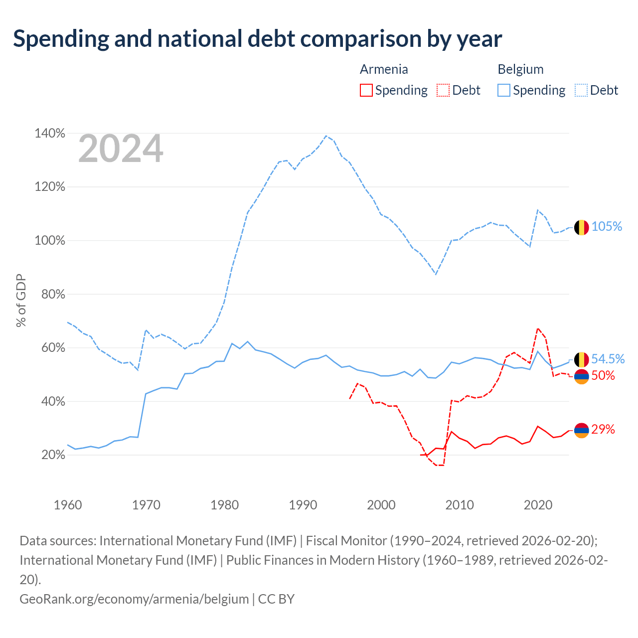 Armenia has $13B in government debt (50% of GDP), compared to $703B (104.7% of GDP) in Belgium.