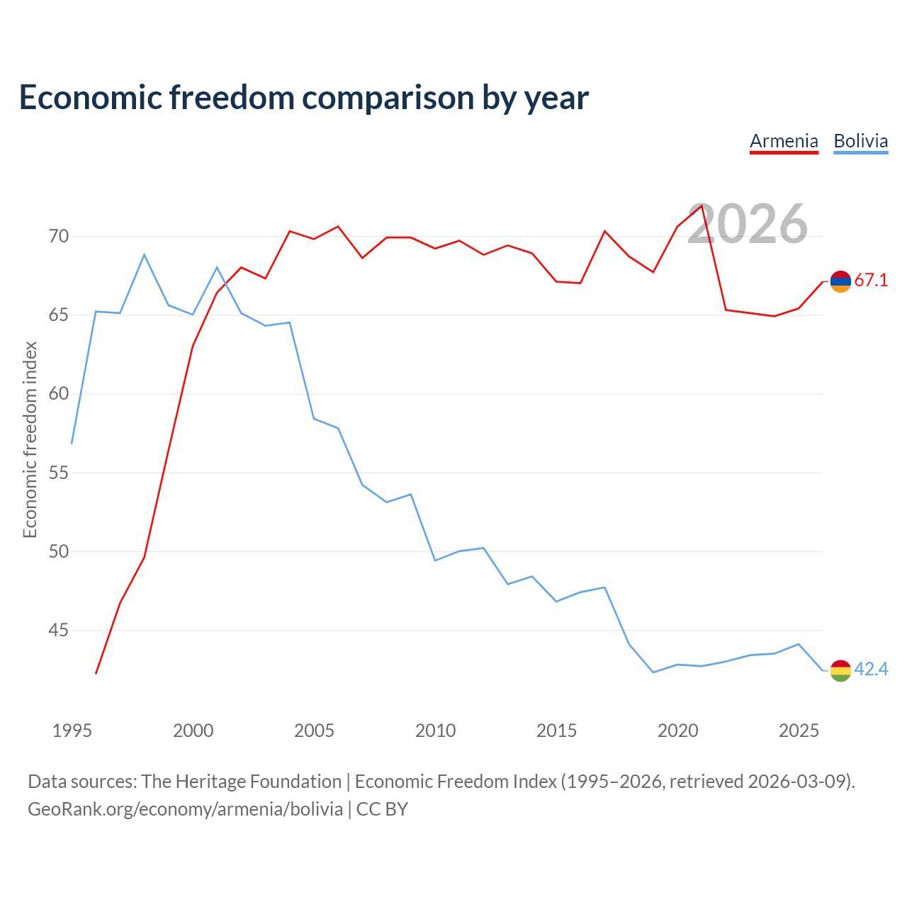 The Economic Freedom Index for Armenia is 67.1, ranking 58/197, compared to 42.4 for Bolivia, ranking 184/197. The chart above displays a comparison of annual changes in economic freedom indexes.