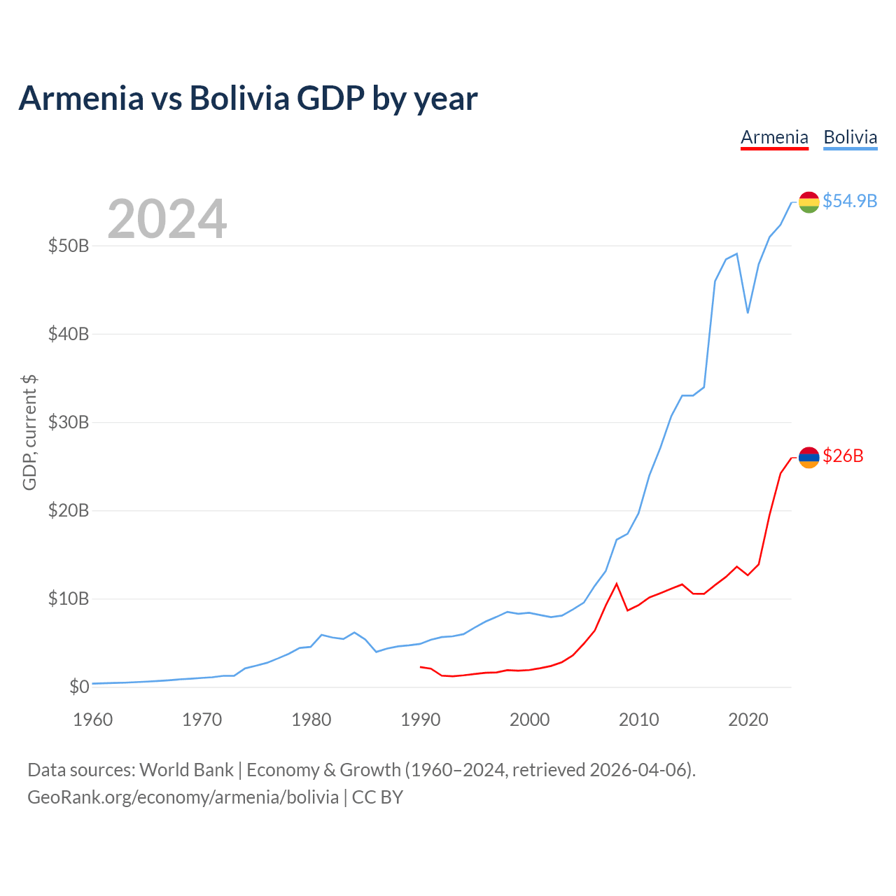 Armenia has a GDP of $26B compared to $54.9B for Bolivia, ranking 114/197 and 88/197 by economy size, respectively.