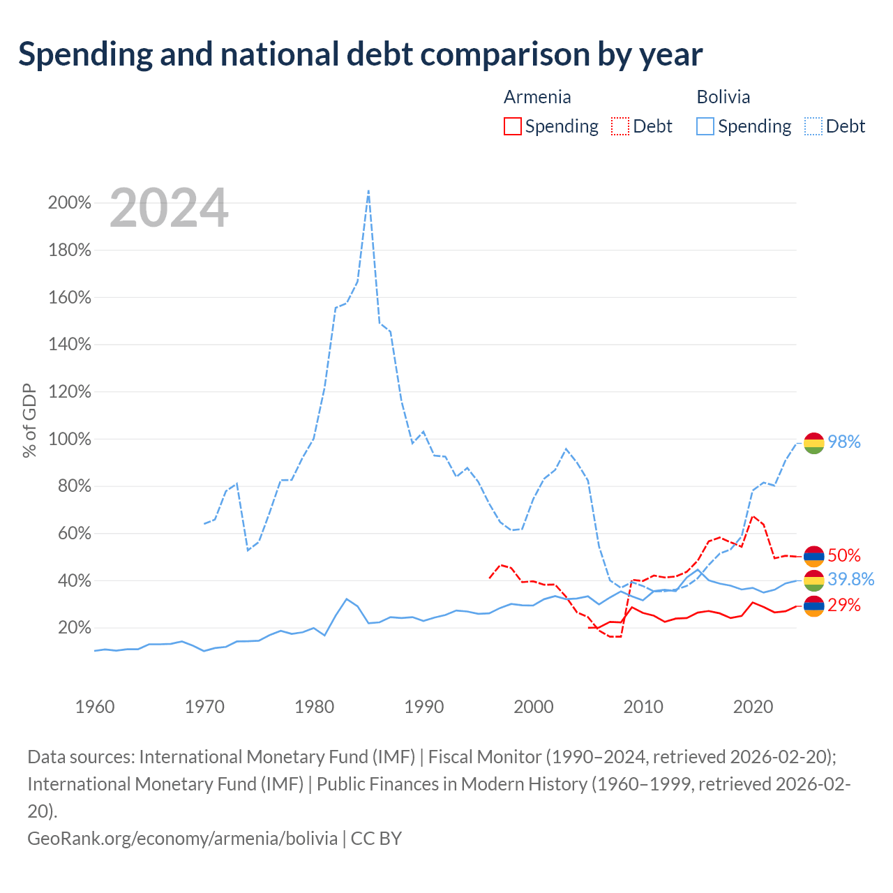 Armenia has $13B in government debt (50% of GDP), compared to $53.8B (98% of GDP) in Bolivia.