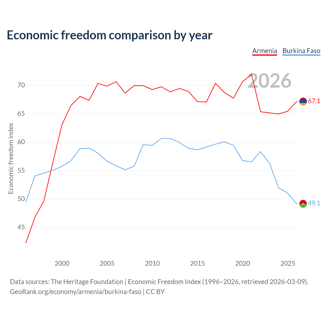 The Economic Freedom Index for Armenia is 67.1, ranking 58/197, compared to 49.1 for Burkina Faso, ranking 167/197. The chart above displays a comparison of annual changes in economic freedom indexes.