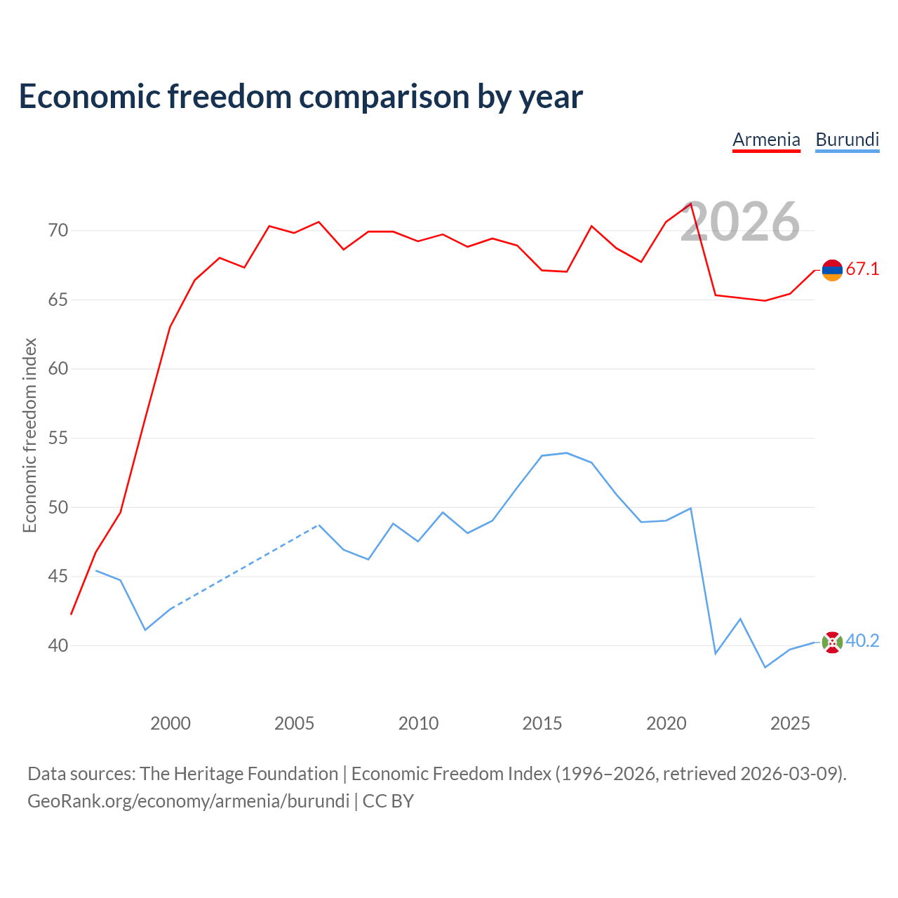 The Economic Freedom Index for Armenia is 67.1, ranking 58/197, compared to 40.2 for Burundi, ranking 187/197. The chart above displays a comparison of annual changes in economic freedom indexes.