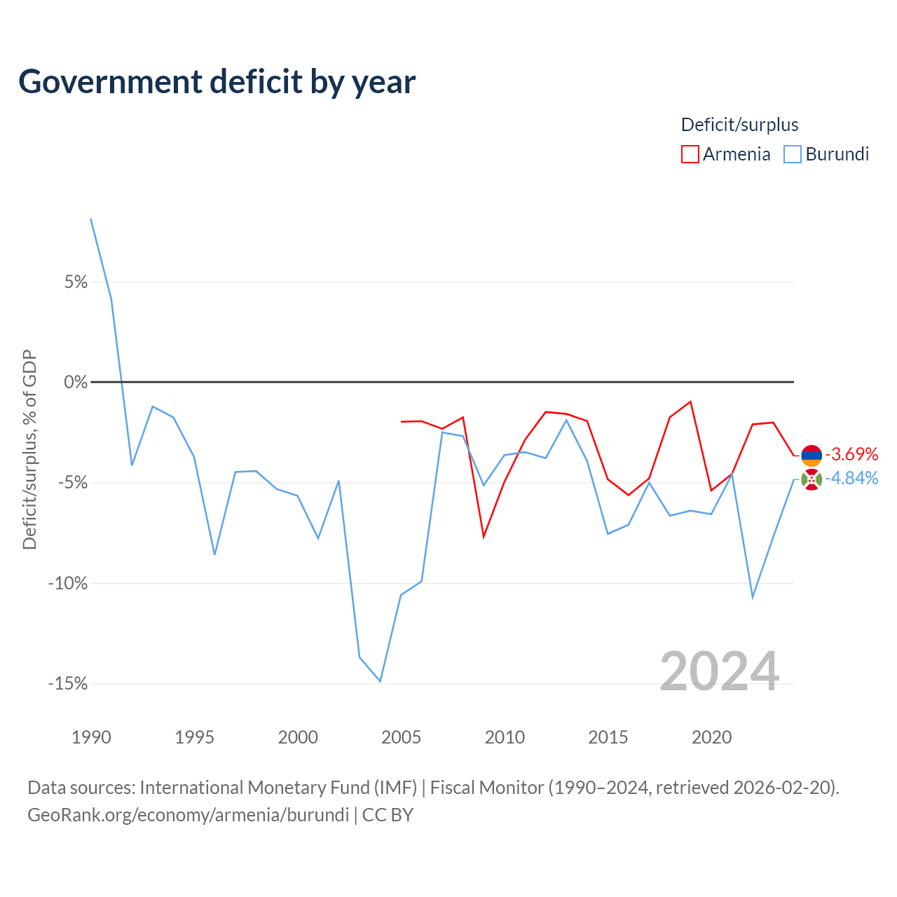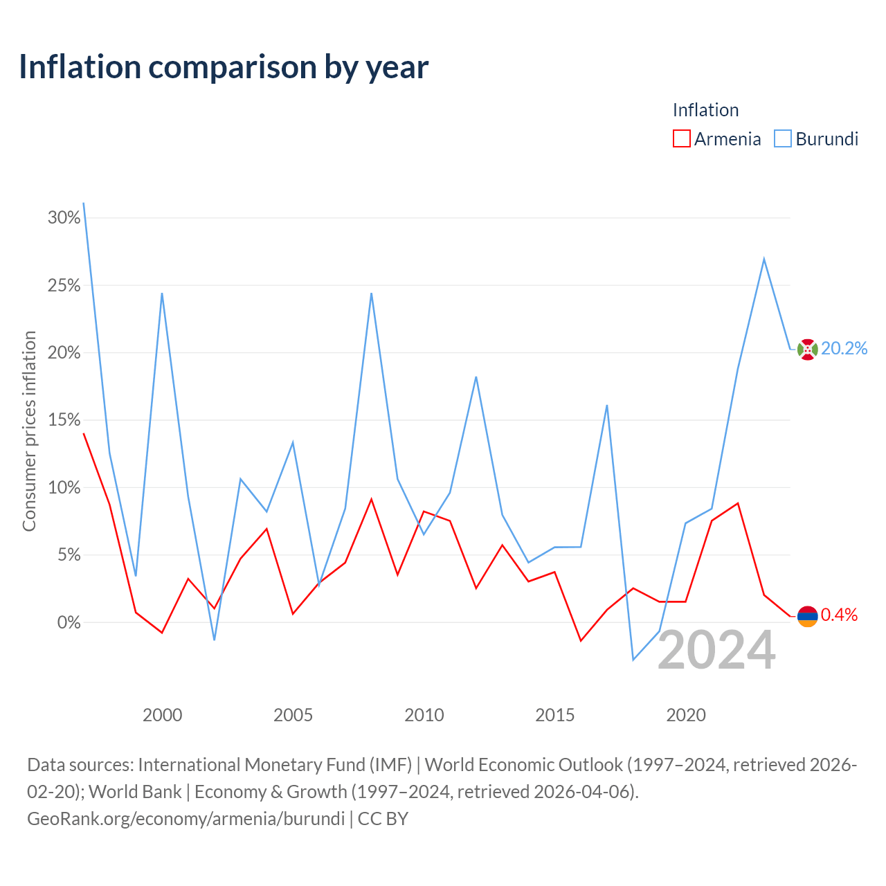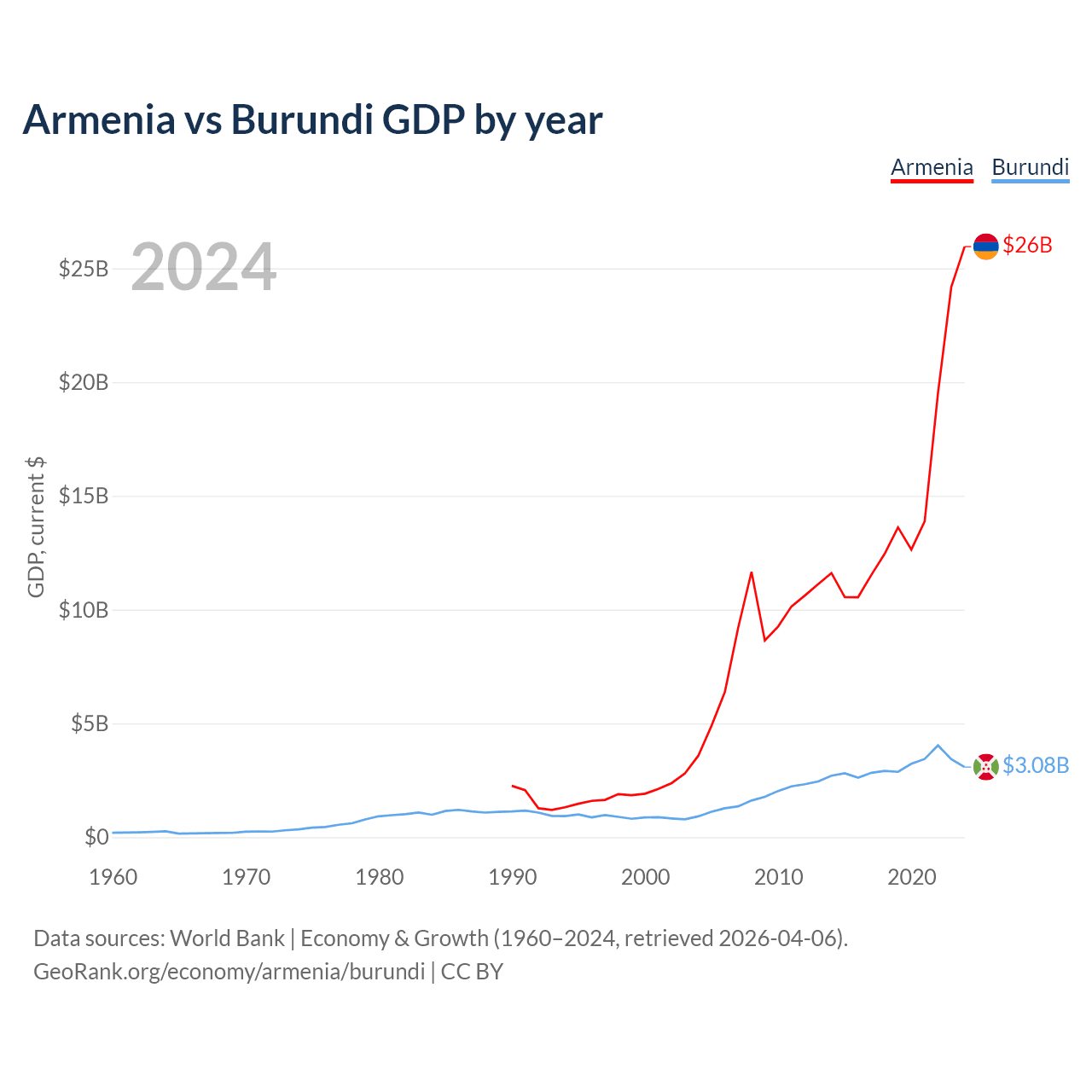 Armenia has a GDP of $26B compared to $3.08B for Burundi, ranking 114/197 and 169/197 by economy size, respectively.