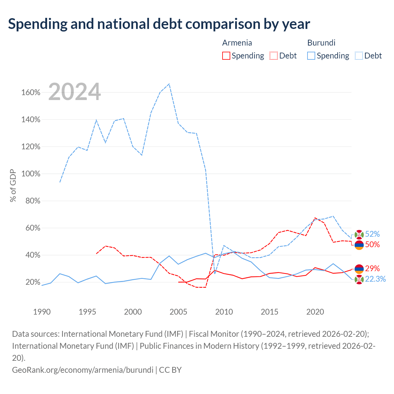 Armenia has $13B in government debt (50% of GDP), compared to $1.6B (52% of GDP) in Burundi.