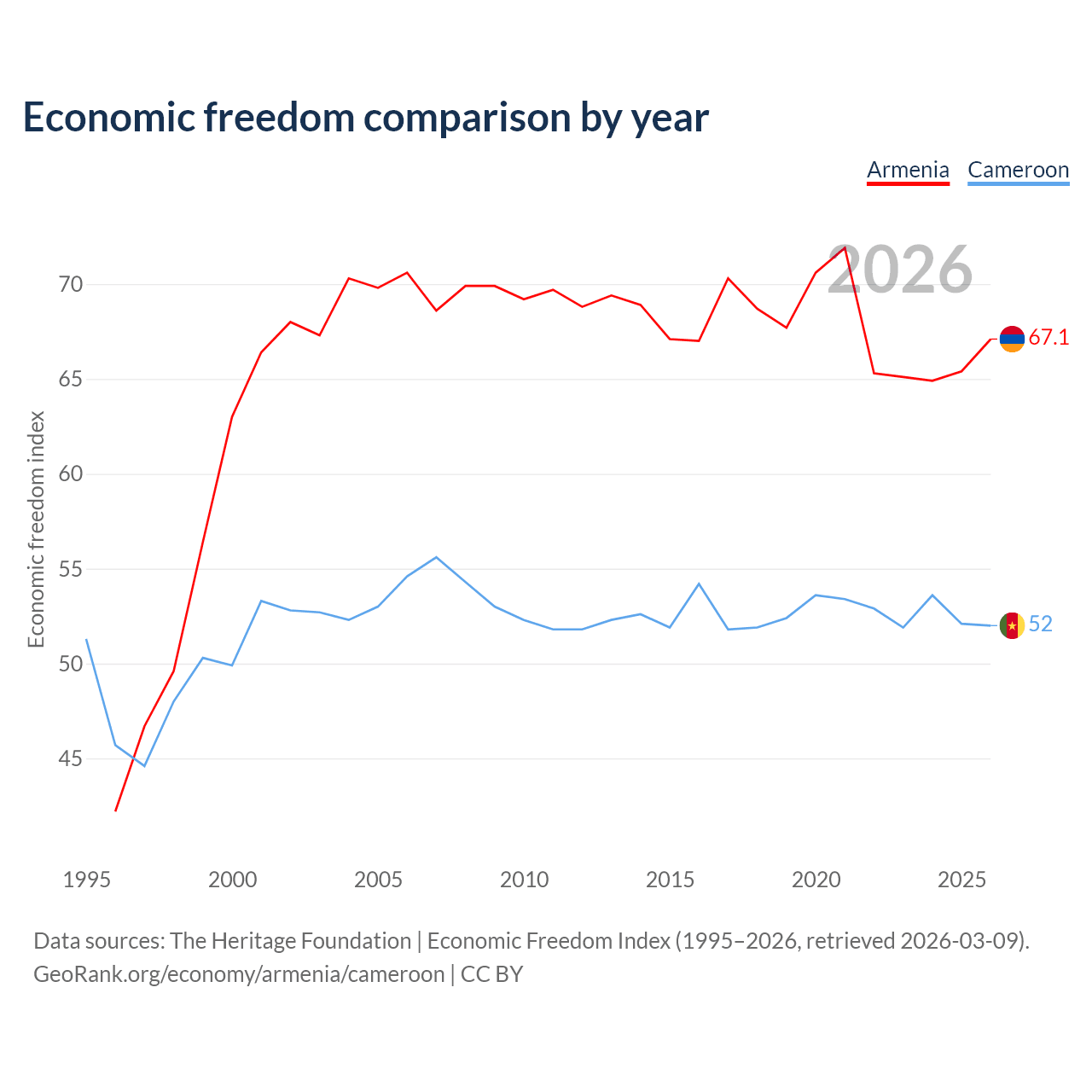 The Economic Freedom Index for Armenia is 67.1, ranking 58/197, compared to 52 for Cameroon, ranking 151/197. The chart above displays a comparison of annual changes in economic freedom indexes.