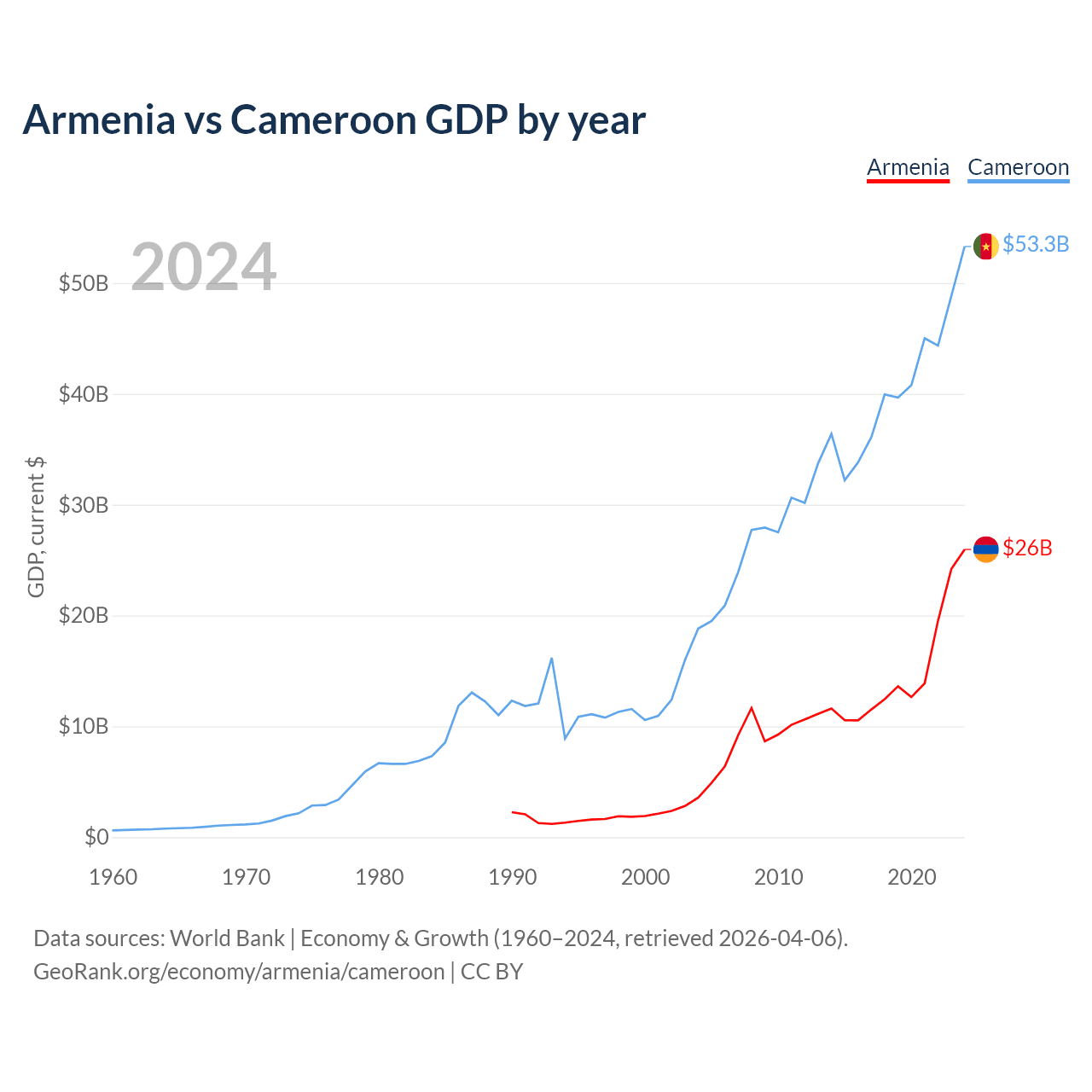 Armenia has a GDP of $26B compared to $53.3B for Cameroon, ranking 114/197 and 91/197 by economy size, respectively.