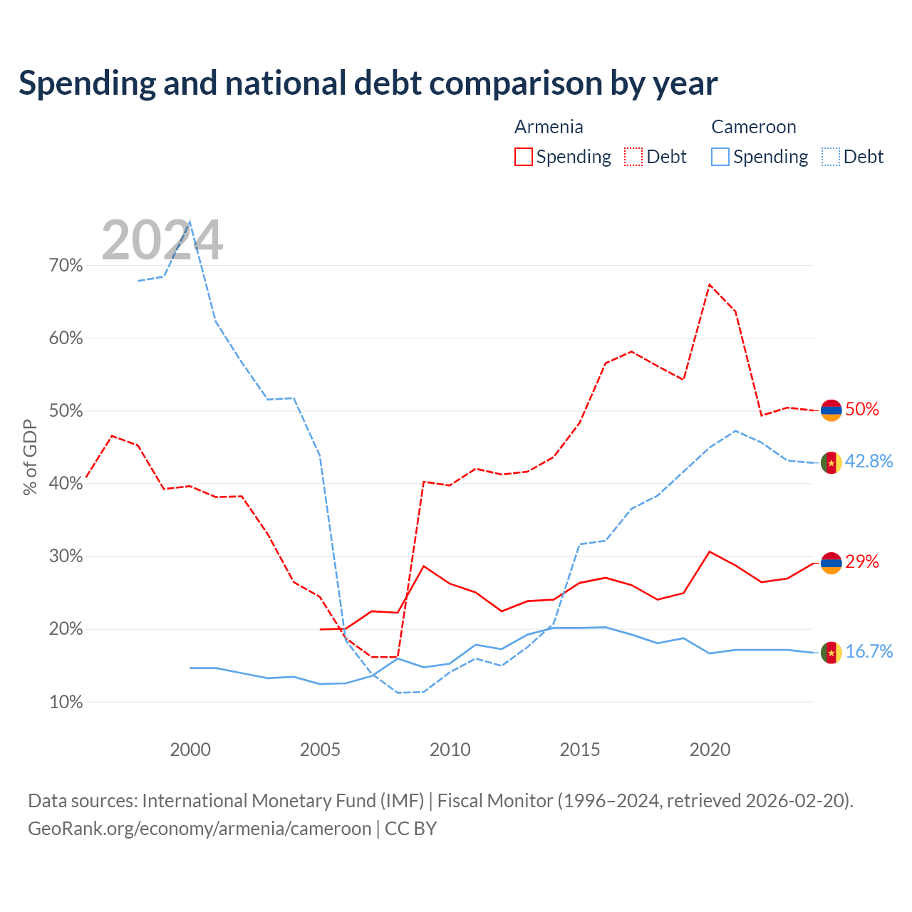 Armenia has $13B in government debt (50% of GDP), compared to $22.8B (42.8% of GDP) in Cameroon.