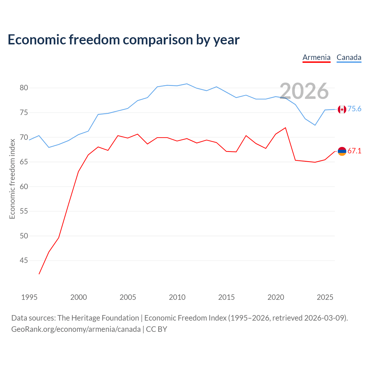 The Economic Freedom Index for Armenia is 67.1, ranking 58/197, compared to 75.6 for Canada, ranking 17/197. The chart above displays a comparison of annual changes in economic freedom indexes.