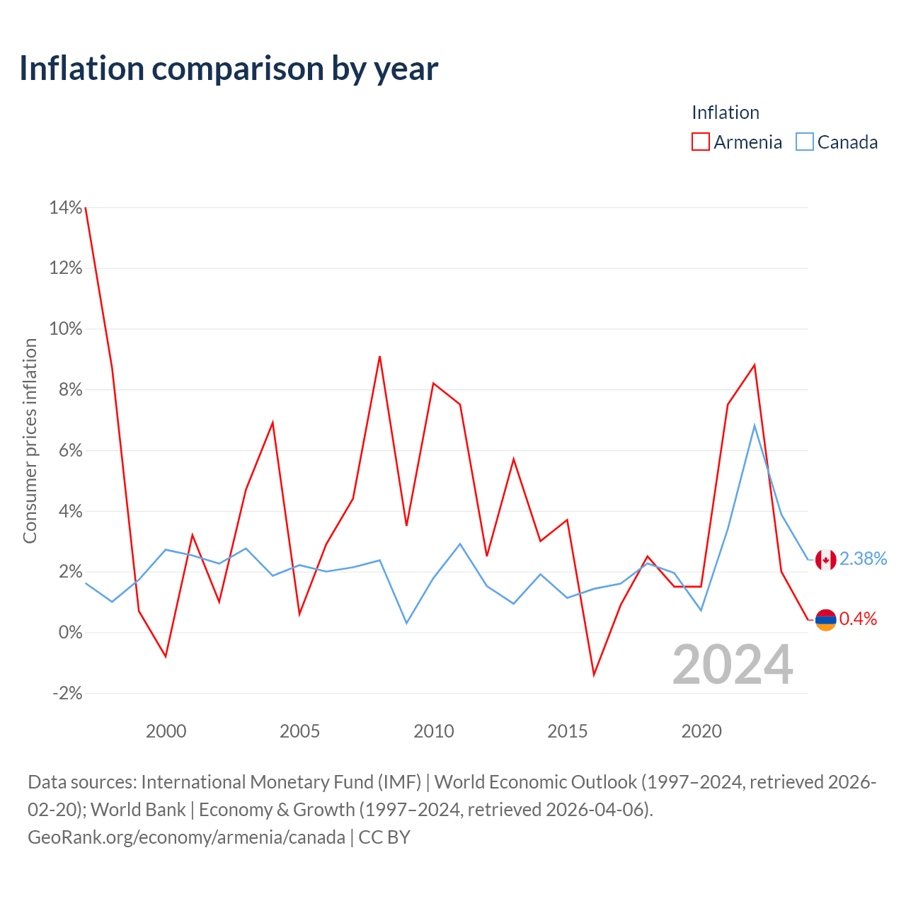 Armenia has a GDP of $26B compared to $2.24T for Canada, ranking 114/197 and 9/197 by economy size, respectively.