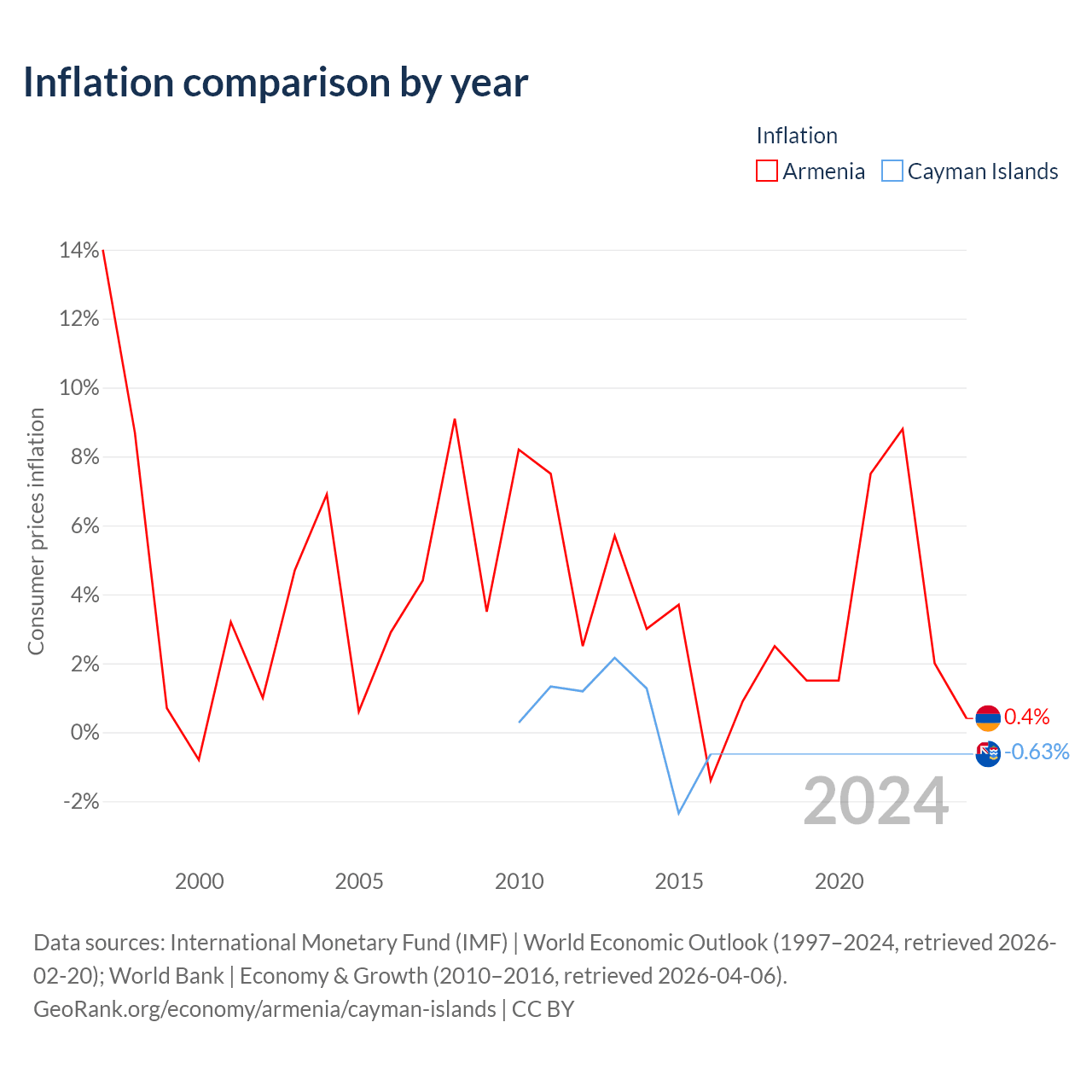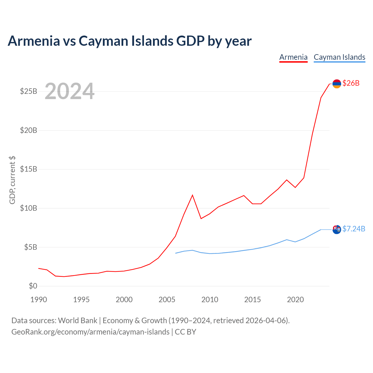 Armenia has a GDP of $26B compared to $7.24B for the Cayman Islands, ranking 114/197 and 158/197 by economy size, respectively.