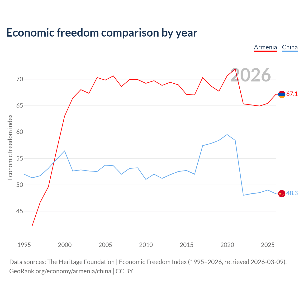 The Economic Freedom Index for Armenia is 67.1, ranking 58/197, compared to 48.3 for China, ranking 170/197. The chart above displays a comparison of annual changes in economic freedom indexes.