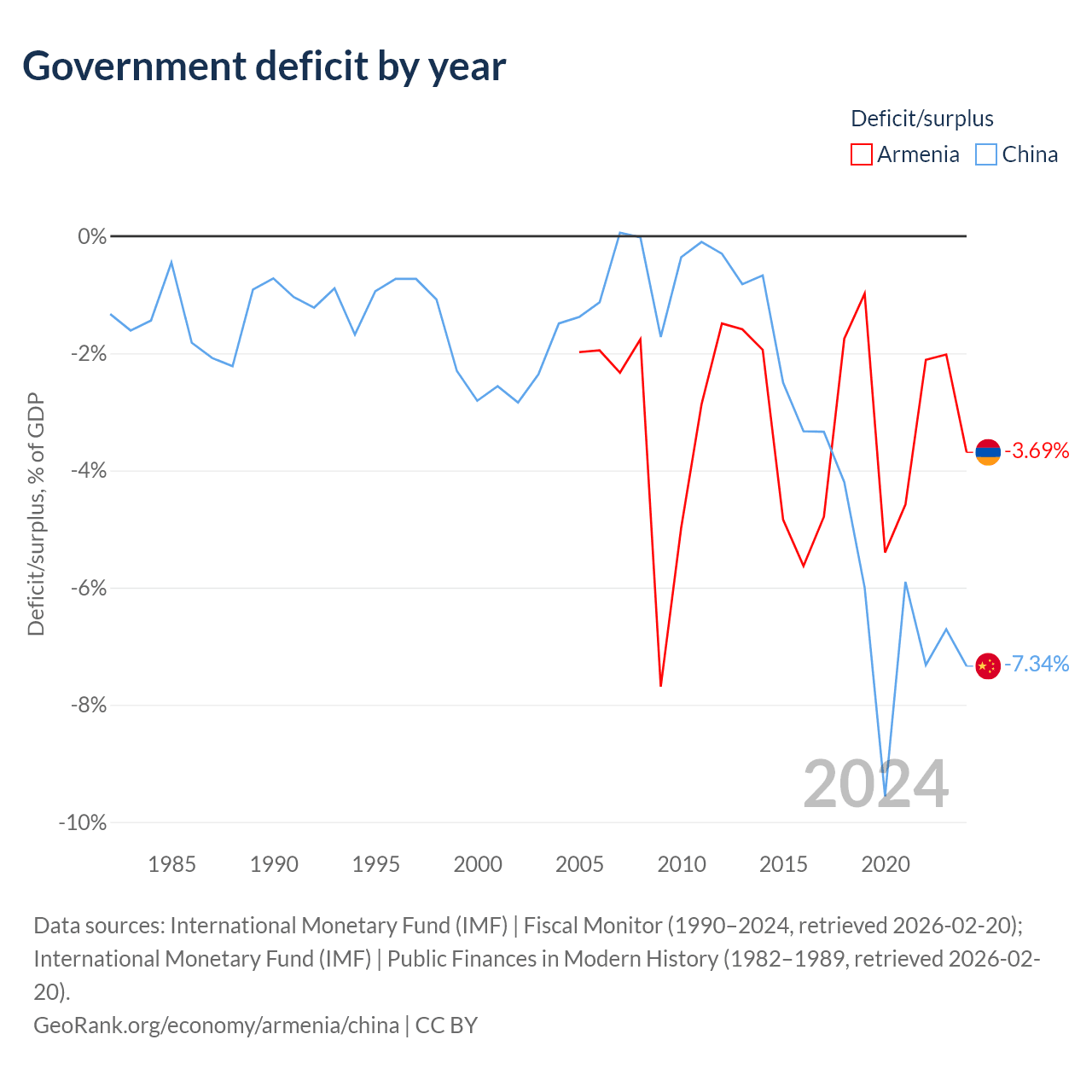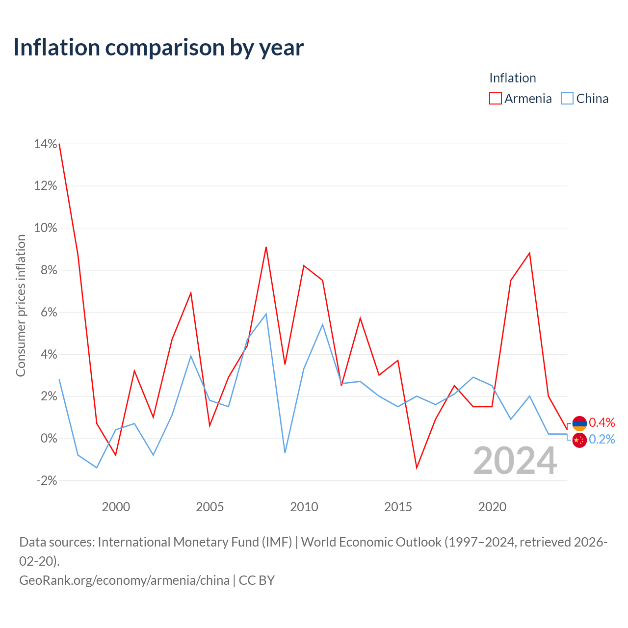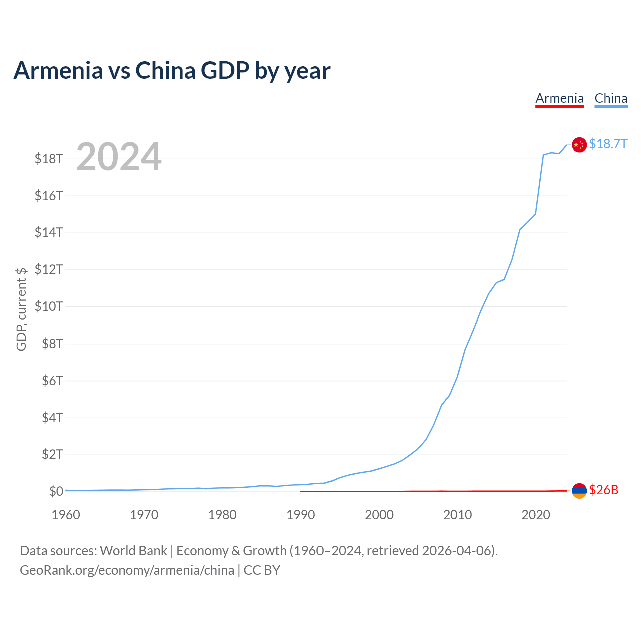 Armenia has a GDP of $26B compared to $18.7T for China, ranking 114/197 and 2/197 by economy size, respectively.