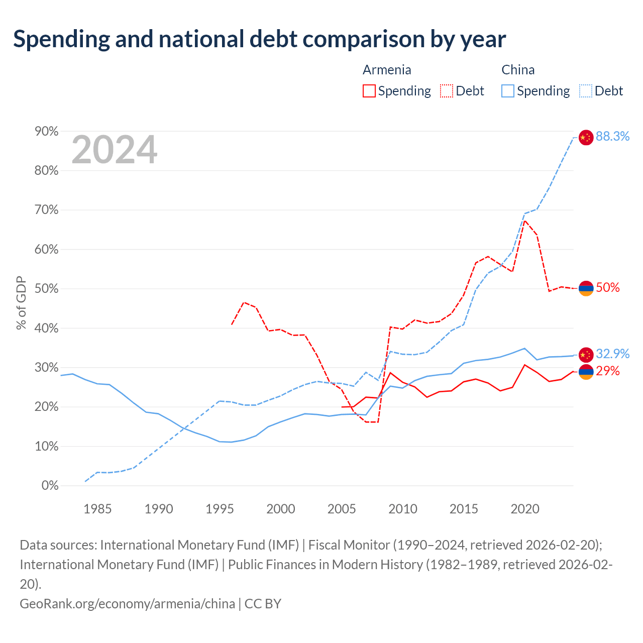 Armenia has $13B in government debt (50% of GDP), compared to $16.6T (88.3% of GDP) in China.