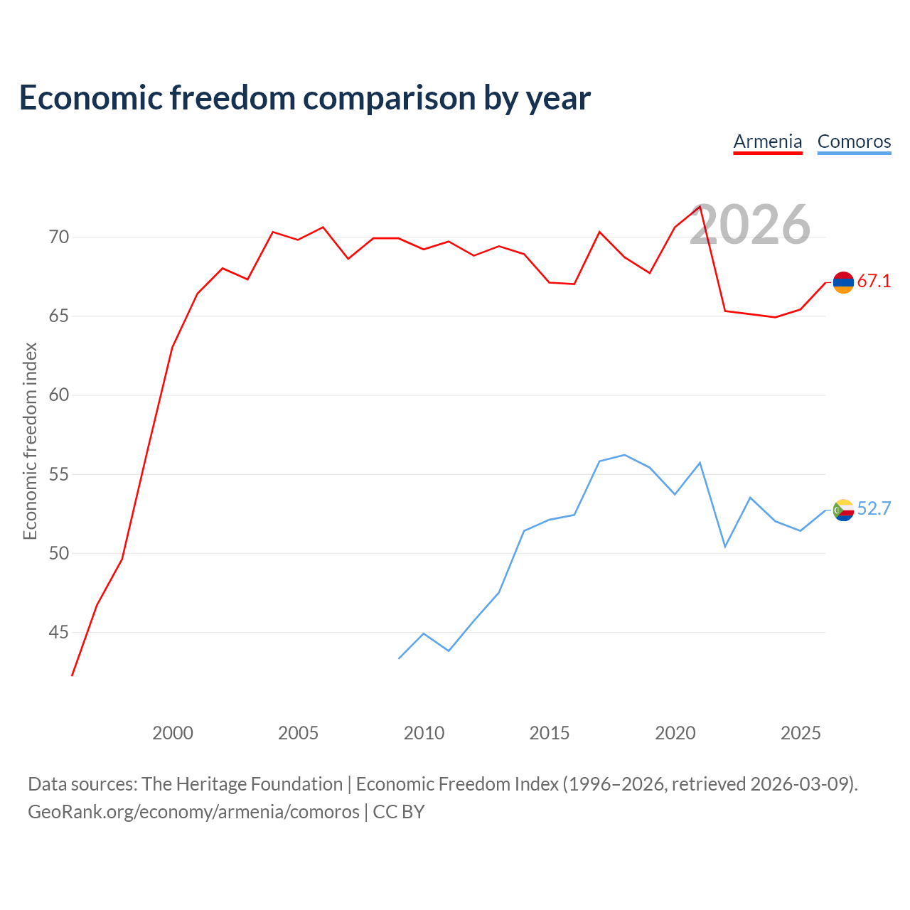The Economic Freedom Index for Armenia is 67.1, ranking 58/197, compared to 52.7 for Comoros, ranking 145/197. The chart above displays a comparison of annual changes in economic freedom indexes.