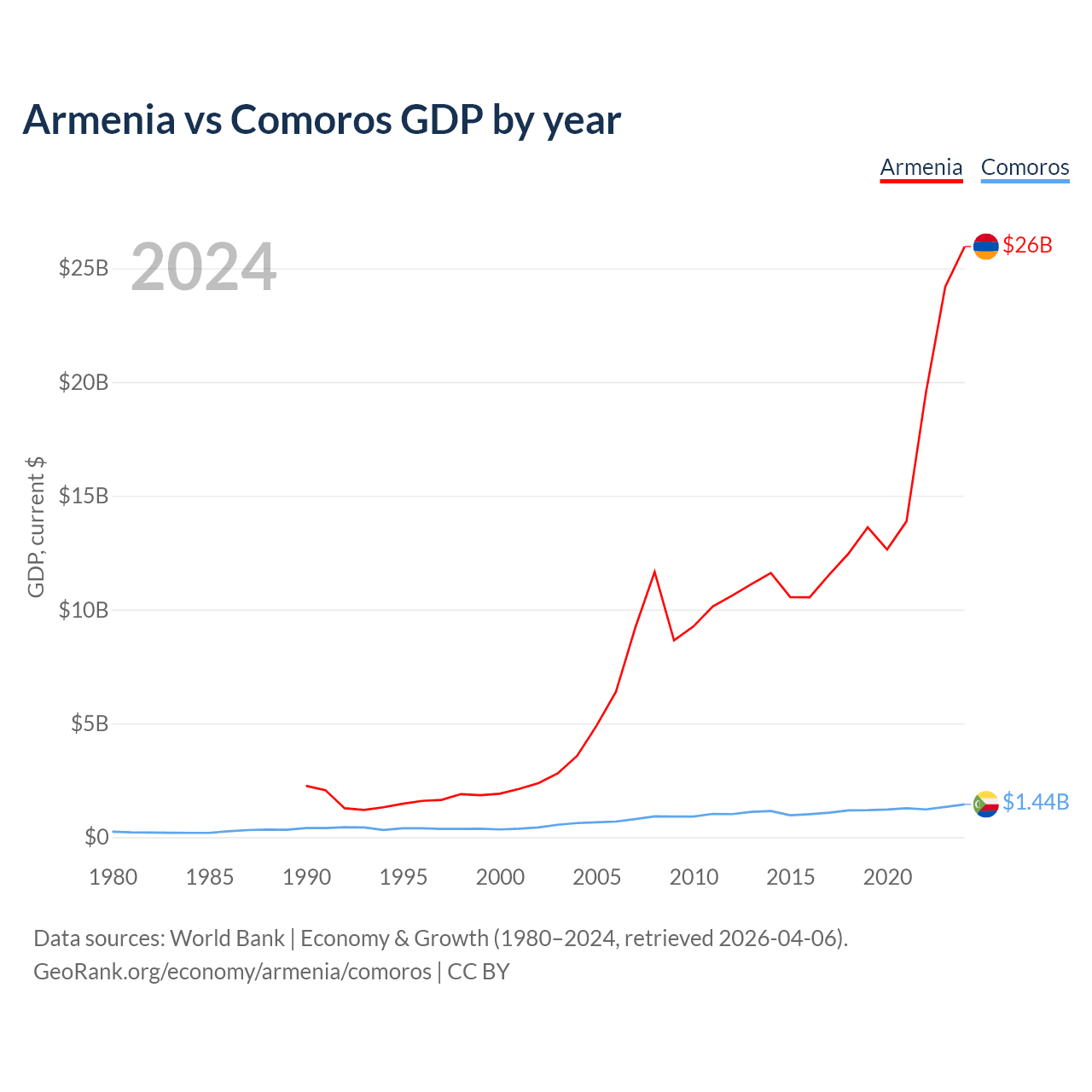 Armenia has a GDP of $26B compared to $1.44B for Comoros, ranking 114/197 and 183/197 by economy size, respectively.