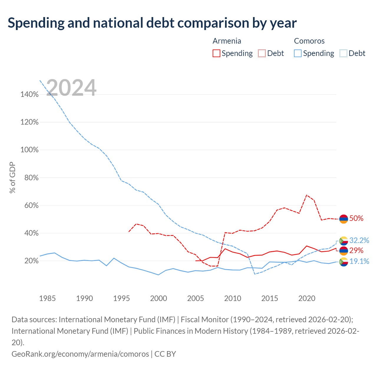 Armenia has $13B in government debt (50% of GDP), compared to $463M (32.2% of GDP) in Comoros.