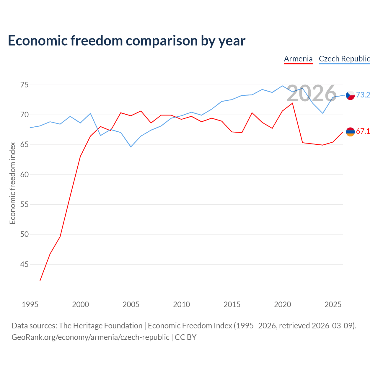 The Economic Freedom Index for Armenia is 67.1, ranking 58/197, compared to 73.2 for the Czech Republic, ranking 25/197. The chart above displays a comparison of annual changes in economic freedom indexes.