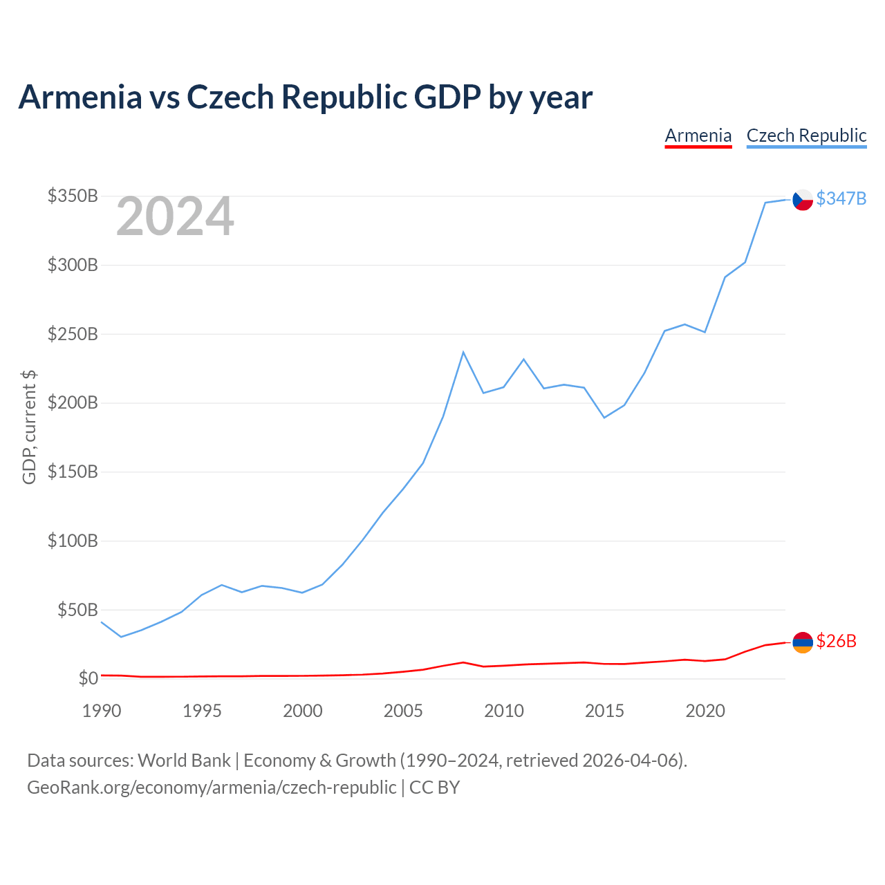 Armenia has a GDP of $26B compared to $347B for the Czech Republic, ranking 114/197 and 44/197 by economy size, respectively.