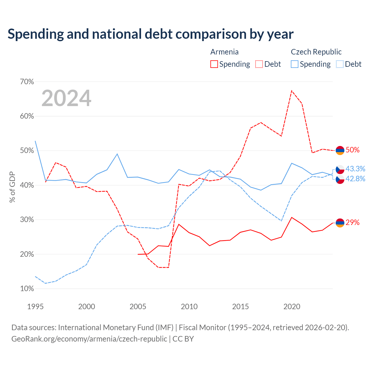 Armenia has $13B in government debt (50% of GDP), compared to $150B (43.3% of GDP) in the Czech Republic.
