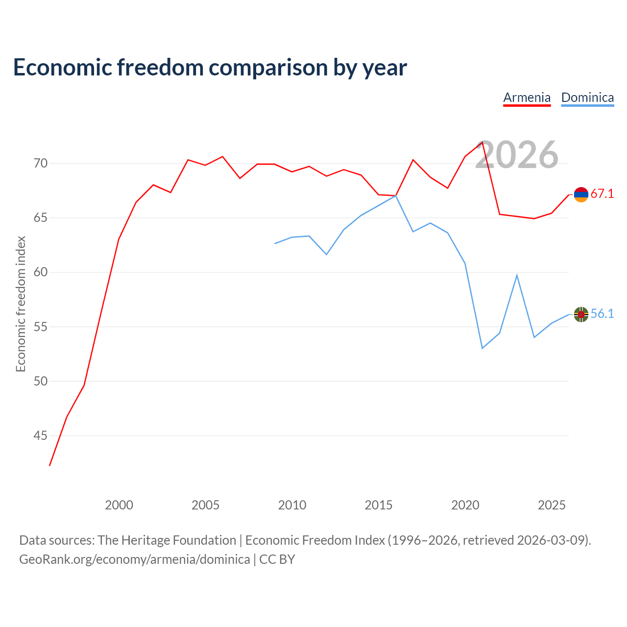 The Economic Freedom Index for Armenia is 67.1, ranking 58/197, compared to 56.1 for Dominica, ranking 124/197. The chart above displays a comparison of annual changes in economic freedom indexes.