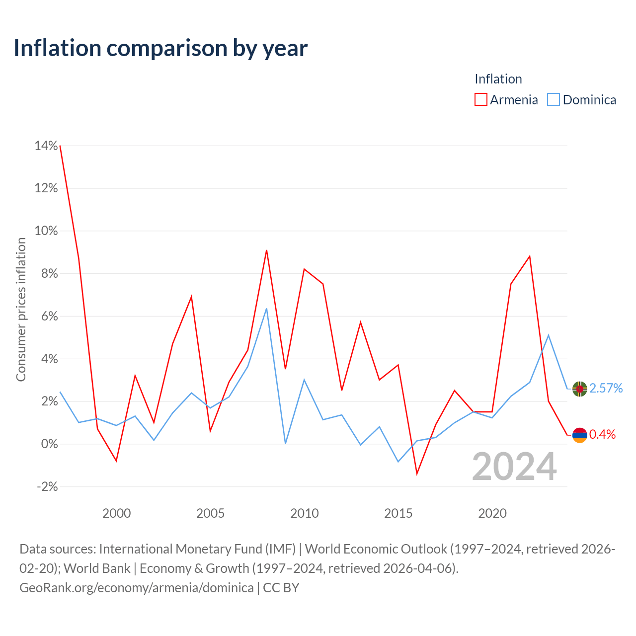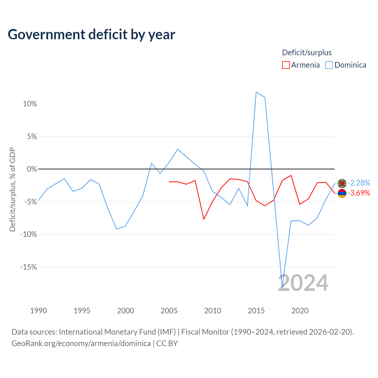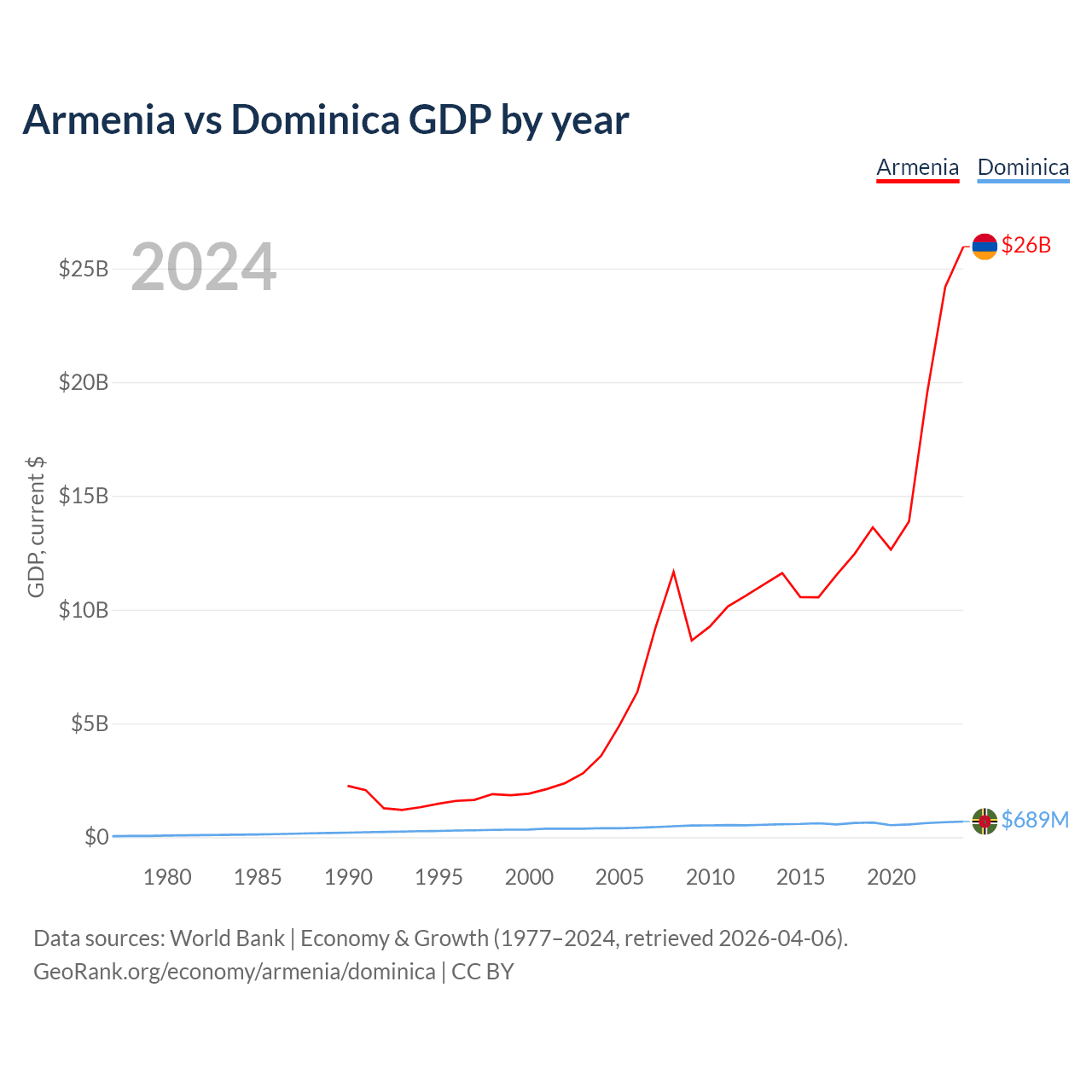 Armenia has a GDP of $26B compared to $689M for Dominica, ranking 114/197 and 190/197 by economy size, respectively.