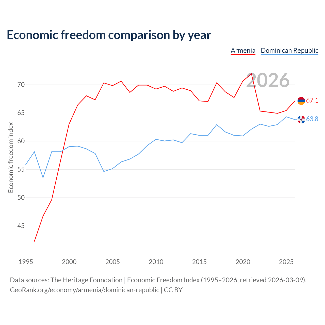 The Economic Freedom Index for Armenia is 67.1, ranking 58/197, compared to 63.8 for the Dominican Republic, ranking 77/197. The chart above displays a comparison of annual changes in economic freedom indexes.