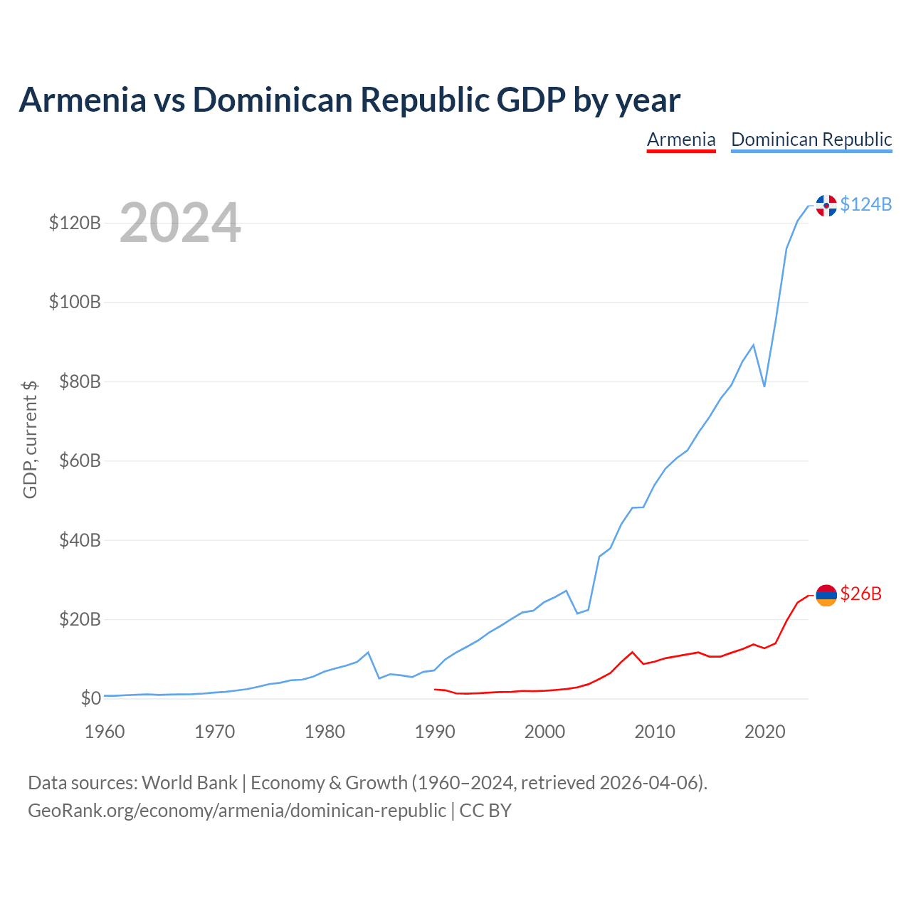 Armenia has a GDP of $26B compared to $124B for the Dominican Republic, ranking 114/197 and 63/197 by economy size, respectively.