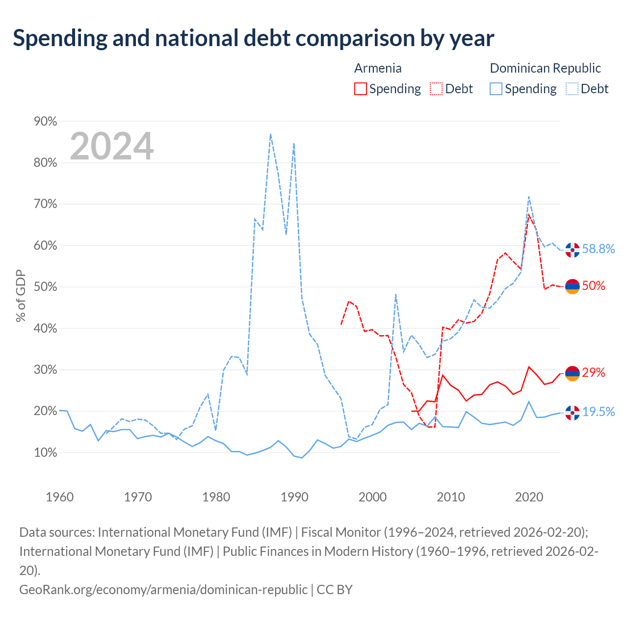 Armenia has $13B in government debt (50% of GDP), compared to $73.1B (58.8% of GDP) in the Dominican Republic.