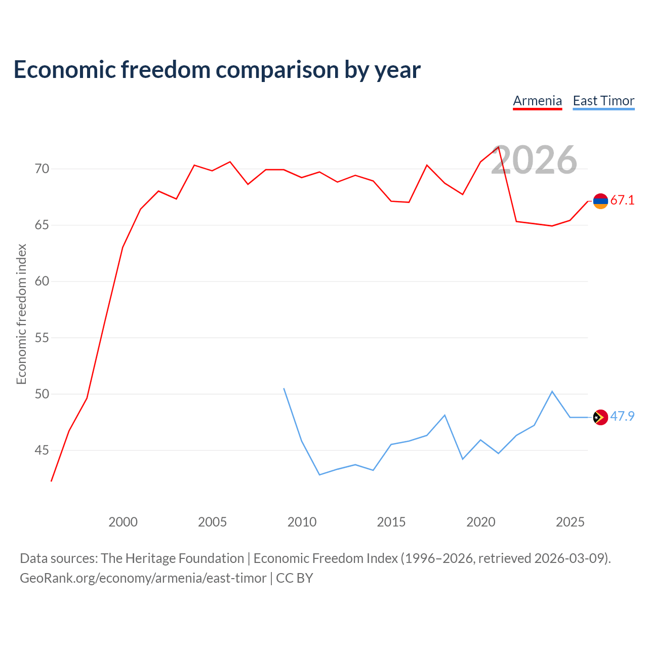 The Economic Freedom Index for Armenia is 67.1, ranking 58/197, compared to 47.9 for East Timor, ranking 173/197. The chart above displays a comparison of annual changes in economic freedom indexes.
