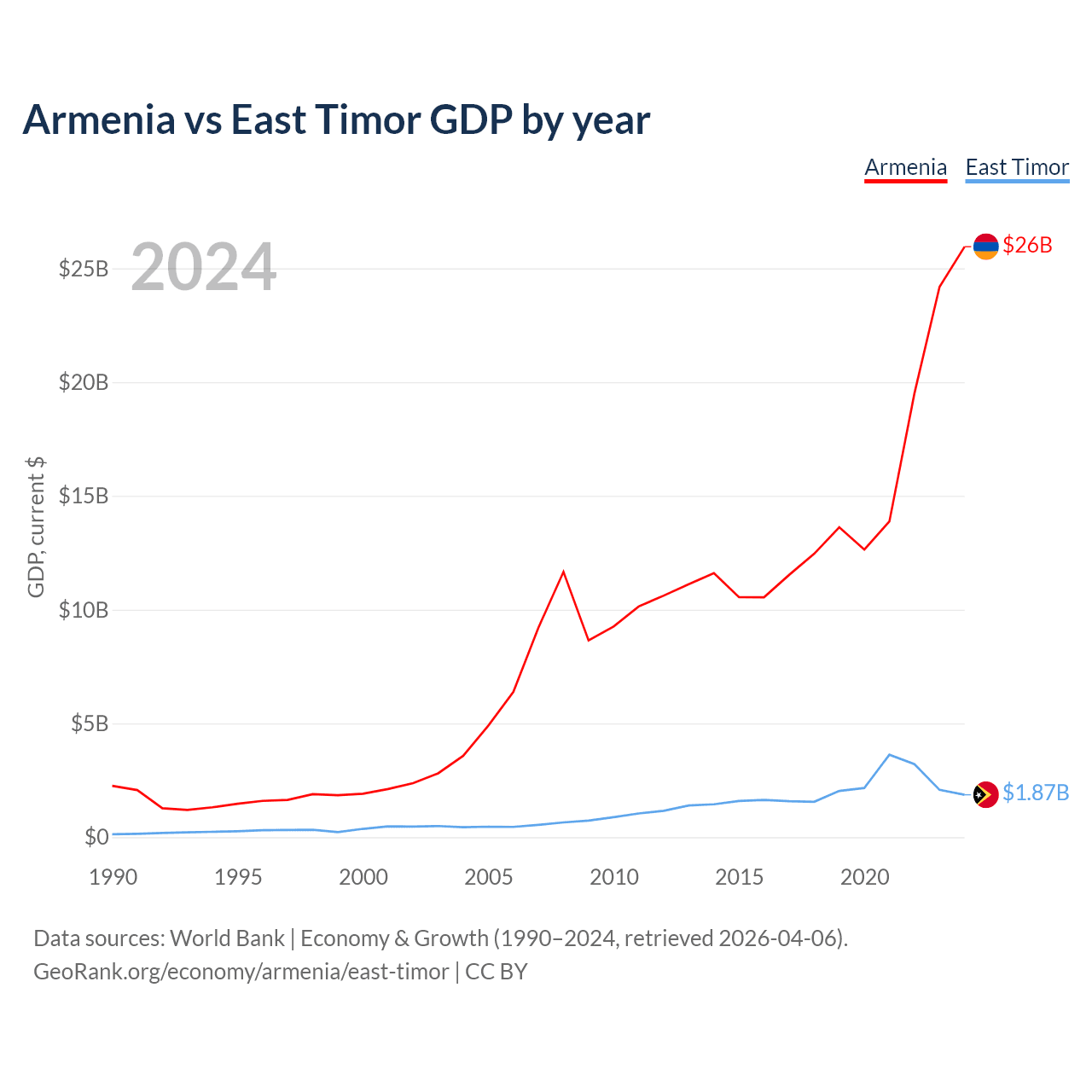 Armenia has a GDP of $26B compared to $1.87B for East Timor, ranking 114/197 and 181/197 by economy size, respectively.