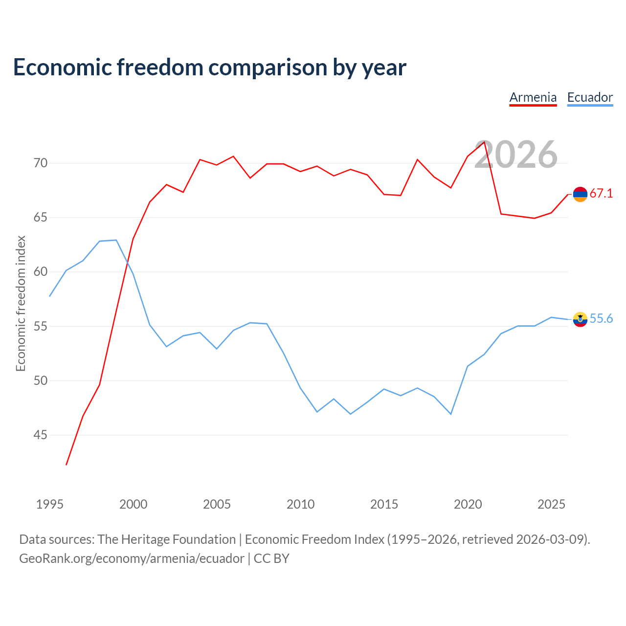 The Economic Freedom Index for Armenia is 67.1, ranking 58/197, compared to 55.6 for Ecuador, ranking 127/197. The chart above displays a comparison of annual changes in economic freedom indexes.