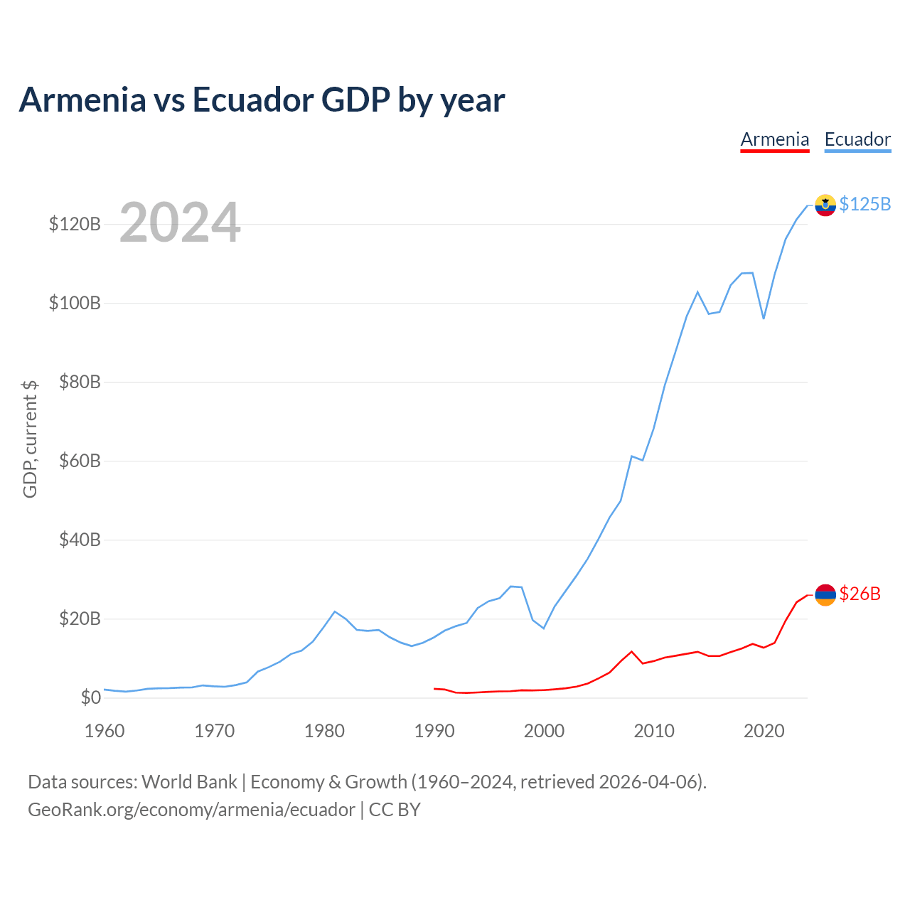 Armenia has a GDP of $26B compared to $125B for Ecuador, ranking 114/197 and 62/197 by economy size, respectively.