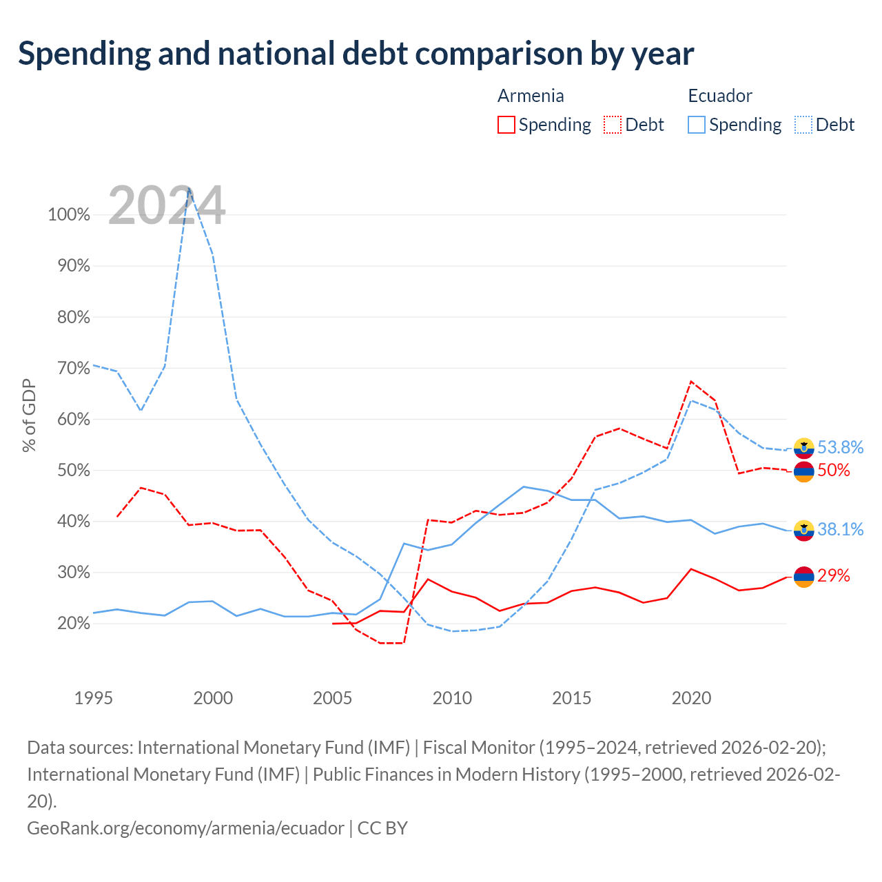 Armenia has $13B in government debt (50% of GDP), compared to $67B (53.8% of GDP) in Ecuador.